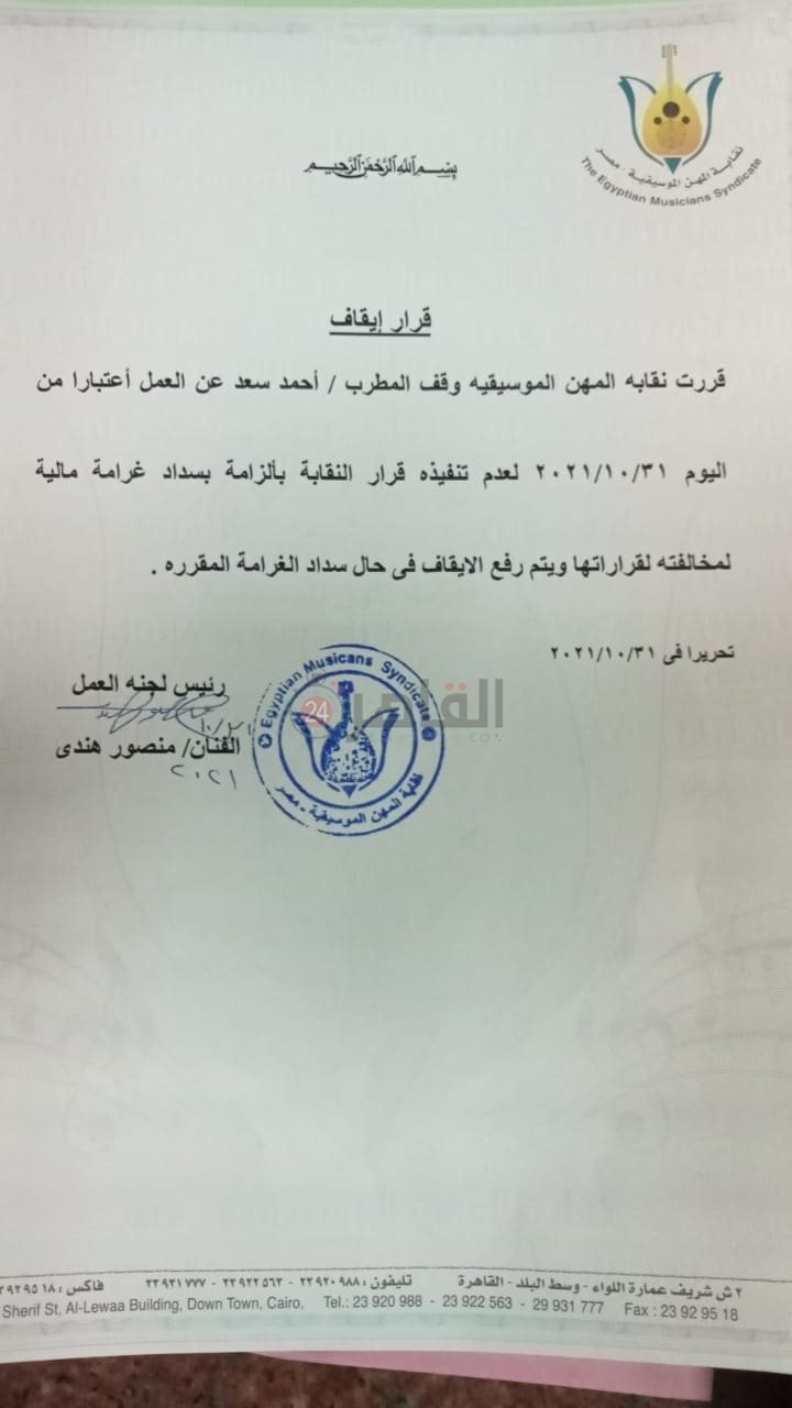 وأصدرت نقابة المهن الموسيقية بيانًا بقرار الإيقاف نص على الآتي: قررت نقابة المهن الموسيقية وقف المطرب أحمد سعد عن العمل اعتبارًا من اليوم 31/10/2021 لعدم تنفيذه قرار النقابة بإلزامه سداد غرامة مالية لمخالفته لقراراتها، ويتم الإلغاء في حال سداد الغرامة المقررة.