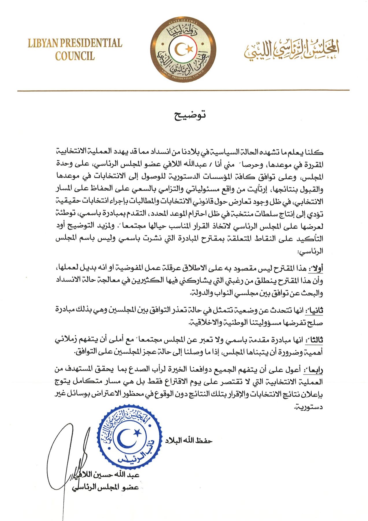 وأوضح اللافي، أن المبادرة جاءت بشكل شخصي منه بعيدًا عن المجلس الرئاسي الليبي، للبحث عن توافق بين مجلسي النواب والدولة، في حالة تعذر التوافق بين المجلسين.