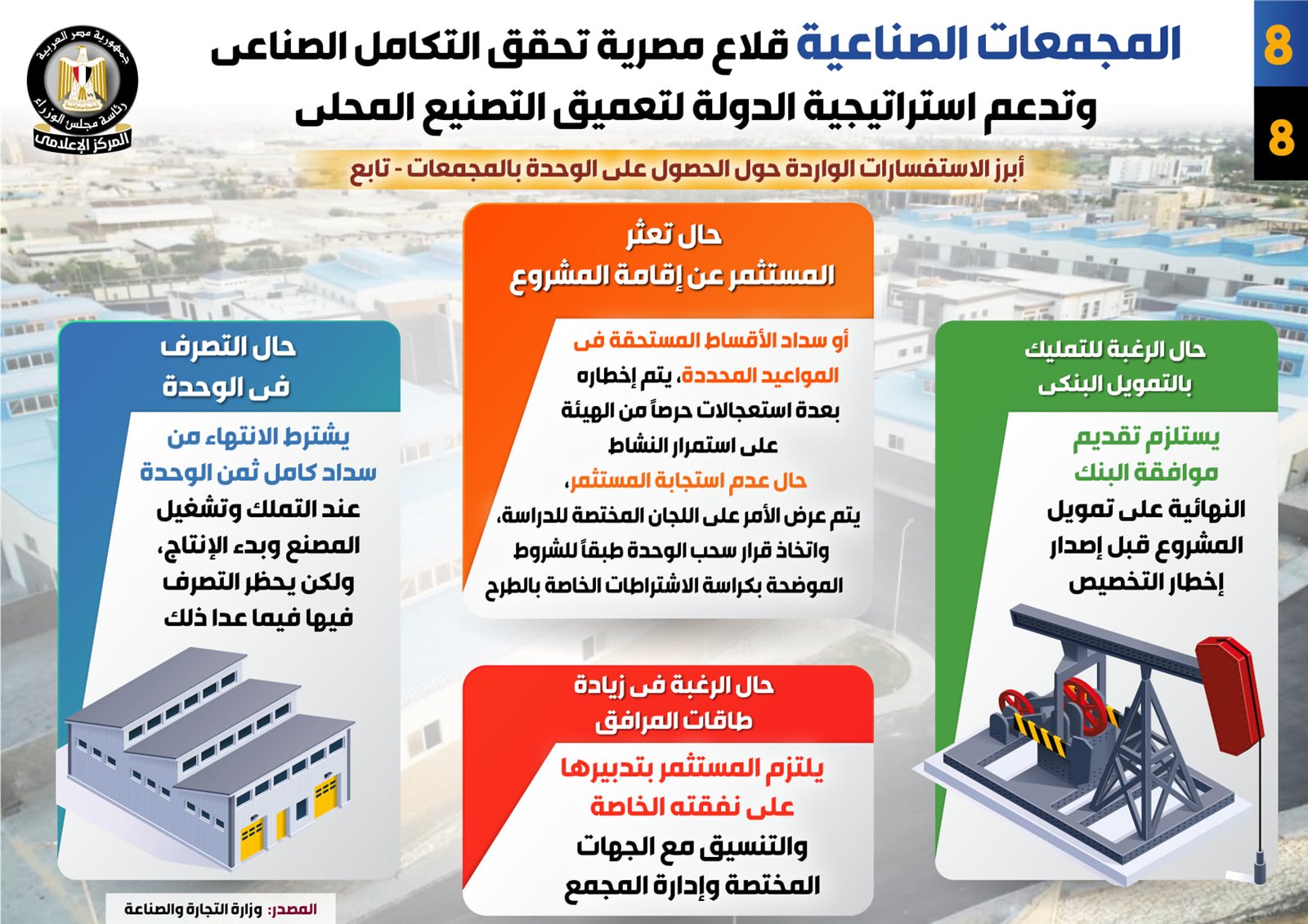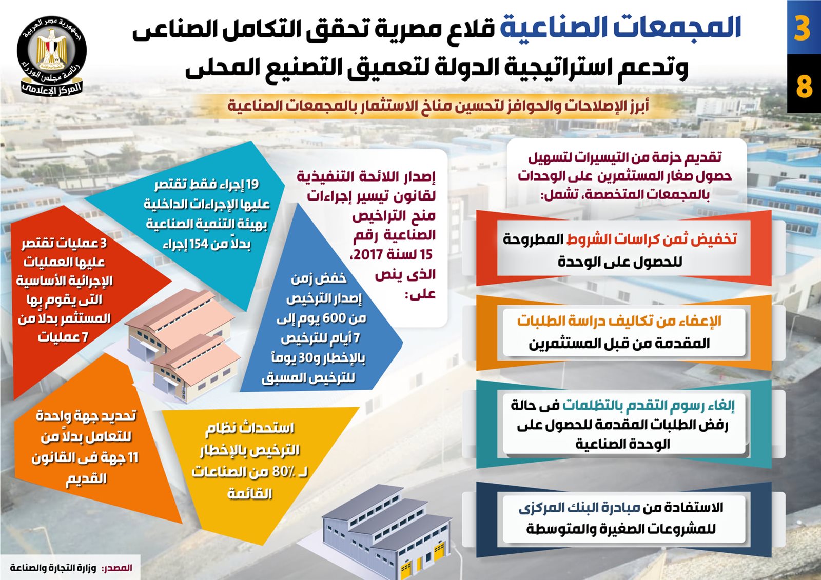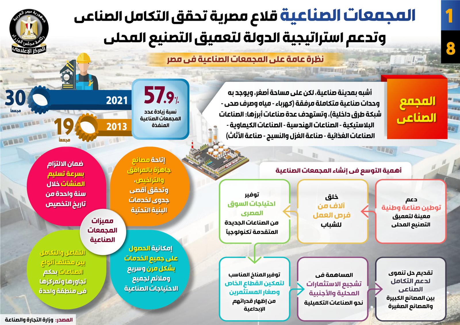 نشر المركز الإعلامي لمجلس الوزراء، تقريرا شمل عدة إنفوجرافات، لتسليط الضوء على المجمعات الصناعية ودورها الفاعل في تحقيق التكامل الصناعي، ودعم استراتيجية الدولة لتعميق التصنيع المحلي.