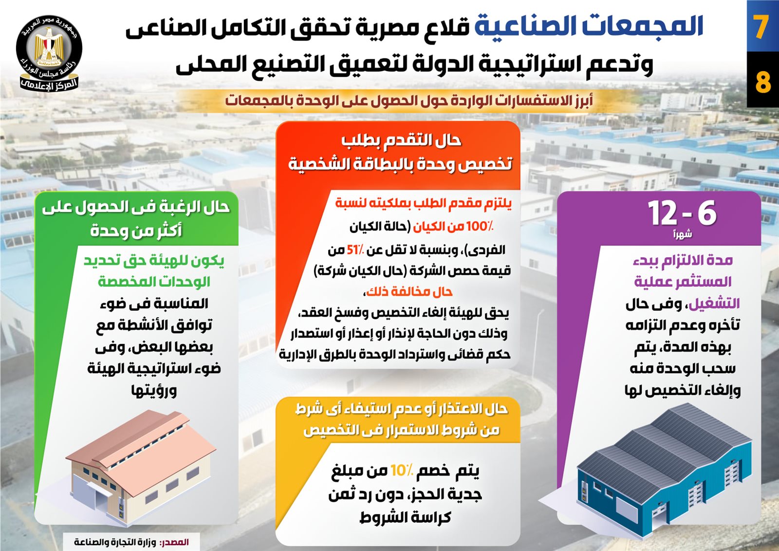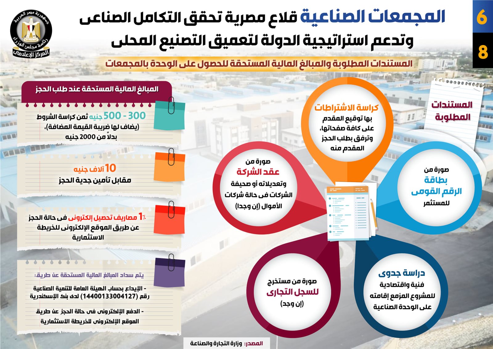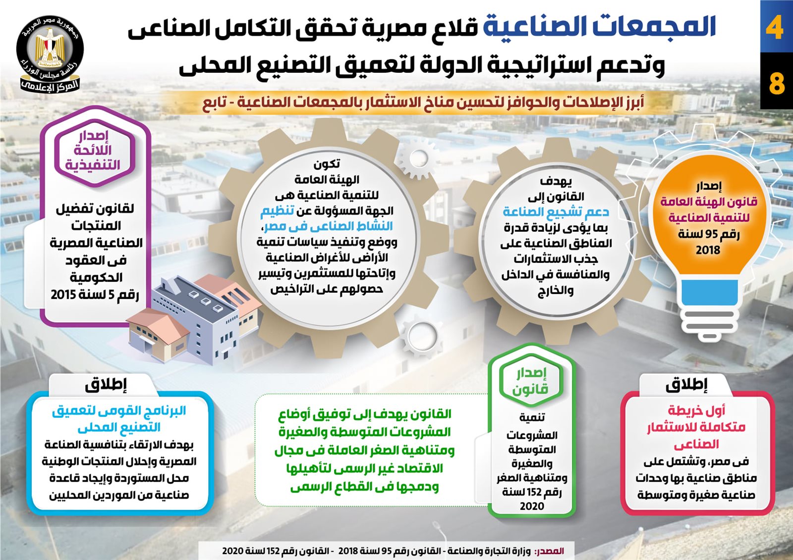 نشر المركز الإعلامي لمجلس الوزراء، تقريرا شمل عدة إنفوجرافات، لتسليط الضوء على المجمعات الصناعية ودورها الفاعل في تحقيق التكامل الصناعي، ودعم استراتيجية الدولة لتعميق التصنيع المحلي.