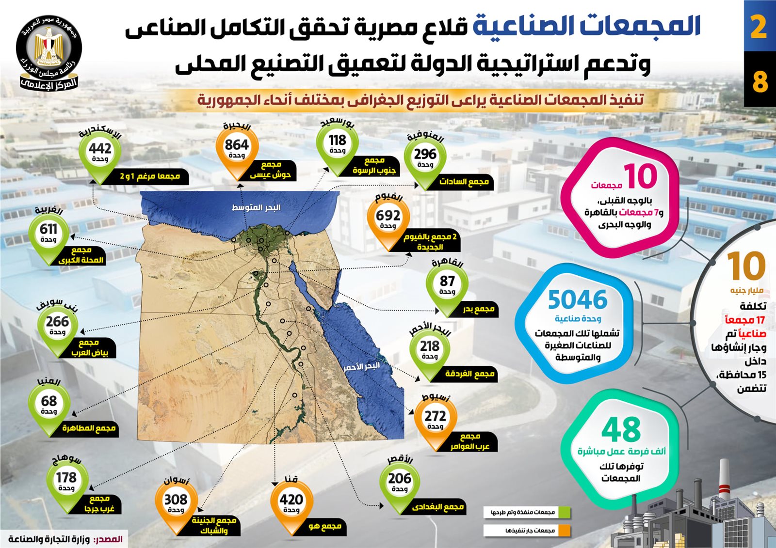 وجاء في التقرير أن تنفيذ المجمعات الصناعية يراعي التوزيع الجغرافي بمختلف أنحاء الجمهورية، حيث تم وجار إنشاء 17 مجمعًا صناعيًا داخل 15 محافظة بتكلفة تصل إلى 10 مليار جنيه، تنقسم إلى 10مجمعات بالوجه القبلي، و7 مجمعات بالقاهرة والوجه البحري، علمًا بأن هذه المجمعات تشمل 5046 وحدة صناعية للصناعات الصغيرة والمتوسطة، وتوفر 48 ألف فرصة عمل مباشرة.
