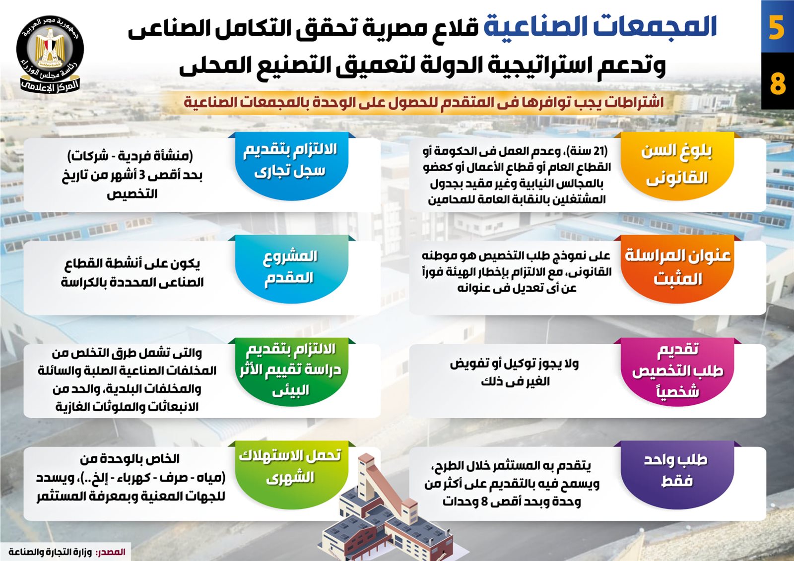 وأورد التقرير الاشتراطات التي يجب توافرها في المتقدم للحصول على الوحدة بالمجمعات الصناعية، وهي بلوغ السن القانوني للمتقدم (21 سنة)، وعدم العمل في الحكومة أو القطاع العام أو قطاع الأعمال أو كعضو بالمجالس النيابية وغير مقيد بجدول المشتغلين بالنقابة العامة للمحامين.