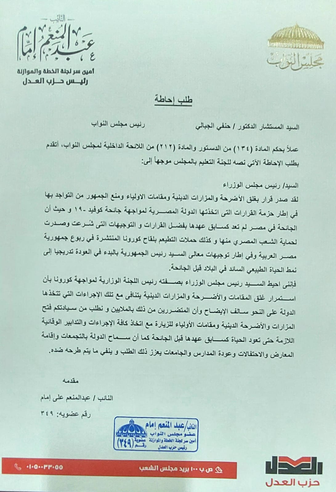 وأوضح رئيس حزب العدل في طلبه أن قرار غلق الأضرحة والمزارات الدينية ومقامات الأولياء ومنع الجمهور من التواجد بها كان في إطار حزمة القرارات التي اتخذتها الدولة المصرية لمواجهة وباء كوفيد -19، حيث إن الجائحة في مصر لم تعد كسابق عهدها بفضل القرارات والتوجيهات التي شُرعت، وصدرت لحماية الشعب المصري منها، وكذلك حملات التطعيم بلقاح كورونا المنتشرة في ربوع جمهورية مصر العربية، وكذلك في إطار توجيهات معالي السيد رئيس الجمهورية بالبدء في العودة تدريجيا إلى نمط الحياة الطبيعي السائد في البلاد قبل الجائحة.