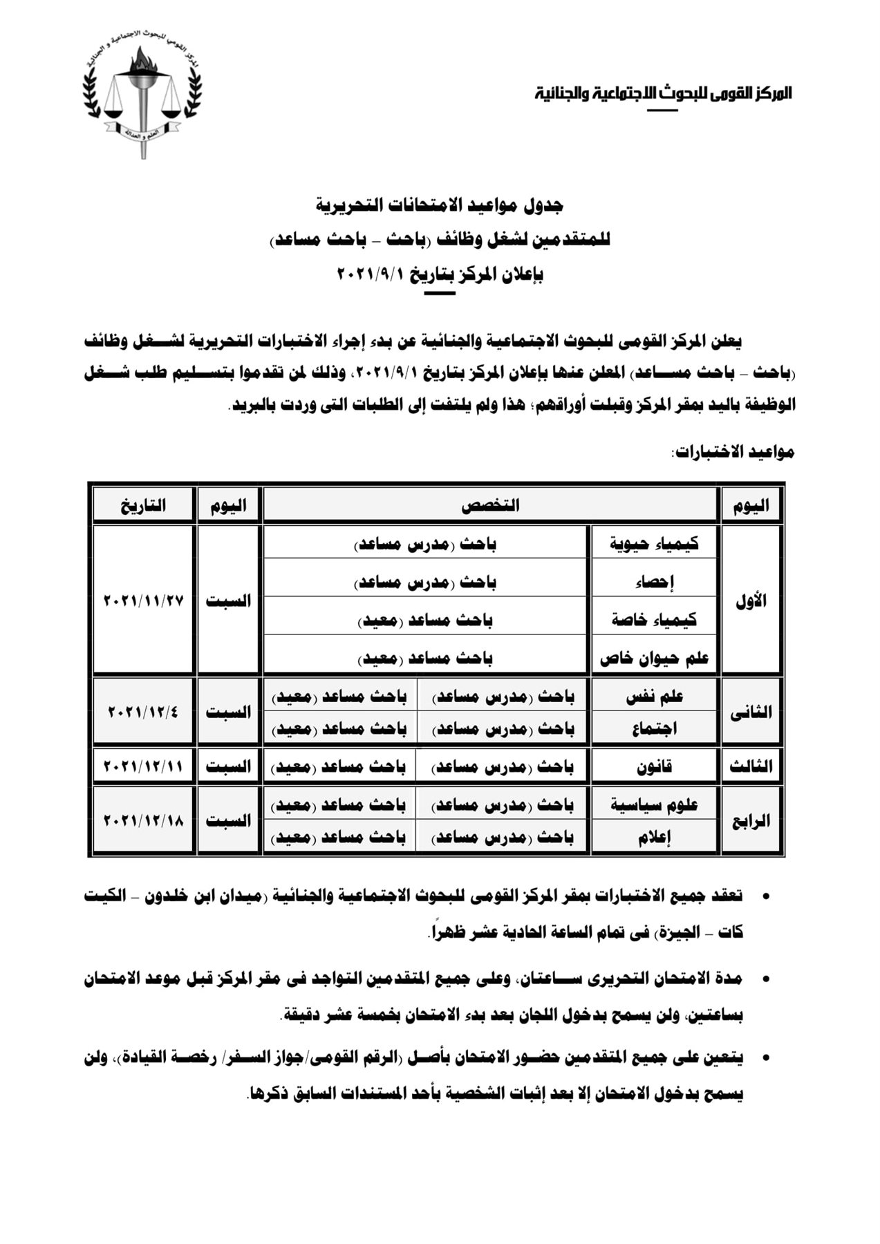ونوه المركز أن كافة الاختبارات تعقد بمقر المركز القومي للبحوث الاجتماعية والجنائية، حيث ميدان ابن خلدون –الكيت كات- الجيزة، في تمام الساعة الحادية عشر ظهرًا، وتكون مدة الامتحان التحريرى سـاعتان، مشددًا على جميع المتقدمين بالتواجد في مقر المركز قبل موعد الامتحان بساعتين، ولن يسمح بدخول اللجان بعد بدء الامتحان بخمسة عشر دقيقة.