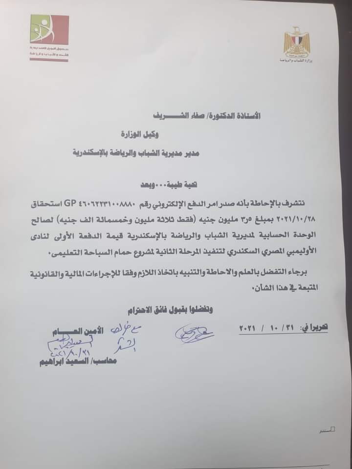 وقدم مجلس إدارة نادي الأولمبي، تقريرًا إلى اللجان المختصة بالبرلمان لمتابعة المشروع من قبل وزارة التخطيط، عن المرحلة الأولى لإنشاء مجمع حمامات السباحة، والذي بموجبه حصل على دعم نقدي سابق بلغ قدره 5 ملايين جنيه مصري لا غير.