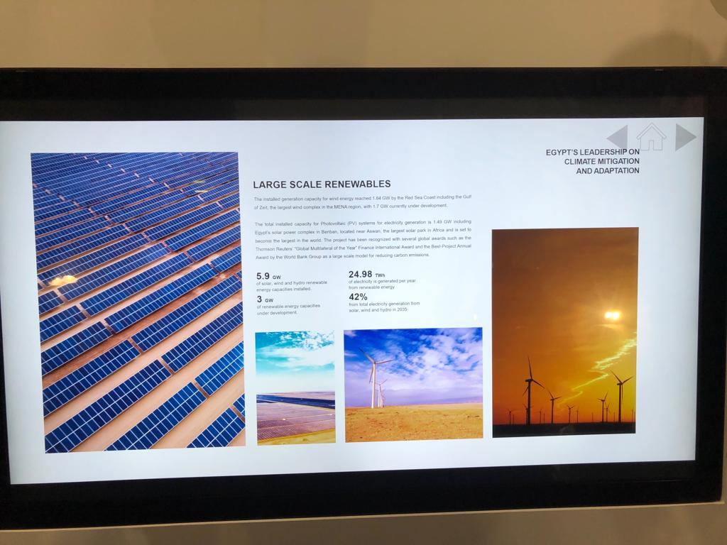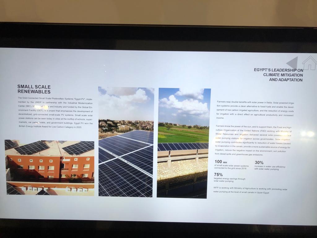 واستعرضت وزيرة البيئة المشروعات التي يعرضها الجناح المصري في مختلف القطاعات ومنها تحسين كفاءة الطاقة والبرنامج القومي لتحويل إضاءة الشوارع إلى أنظمة الإضاءة الموفرة للطاقة بتقنية الليد كذلك مشروع خليج الزيت، ومجمع الطاقة الشمسية في بنبان بالقرب من أسوان، ومشروع تطوير أنظمة كهروضوئية لامركزية صغيرة الحجم ومتصلة بالشبكة، ومحطات ضخ المياه السطحية التي تعمل بالطاقة الشمسية للري في المحافظات.