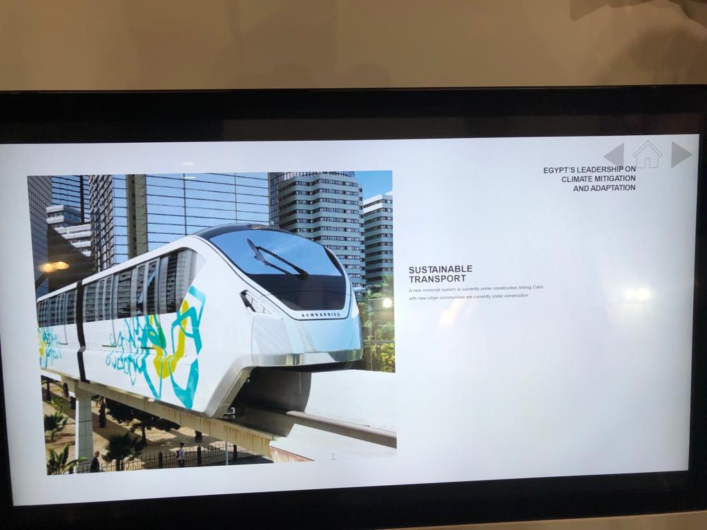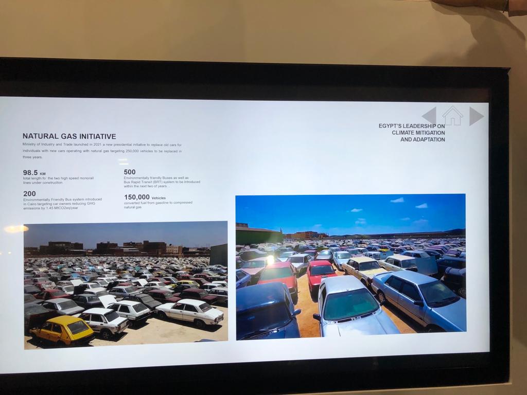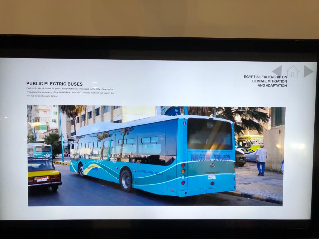 وفى مجال النقل المستدام، مشروع تمديد خط مترو الأنفاق الثالث وتنفيذ الخط الرابع، والمبادرة الرئاسية الجديدة لاستبدال السيارات القديمة للأفراد بسيارات جديدة تعمل بالغاز الطبيعي وتستهدف 250 ألف سيارة يتم استبدالها خلال ثلاث سنوات، بالإضافة إلى دخول الخدمة أول أتوبيسات كهربائية تستخدم للنقل العام في مصر بمدينة الإسكندرية، وتنفيذ أول نظام لمشاركة الدراجات في محافظة الفيوم لتحفيز المواطنين، خاصة الشباب على مكافحة تغير المناخ، وسيتم تكرار التجربة في وسط مدينة القاهرة.