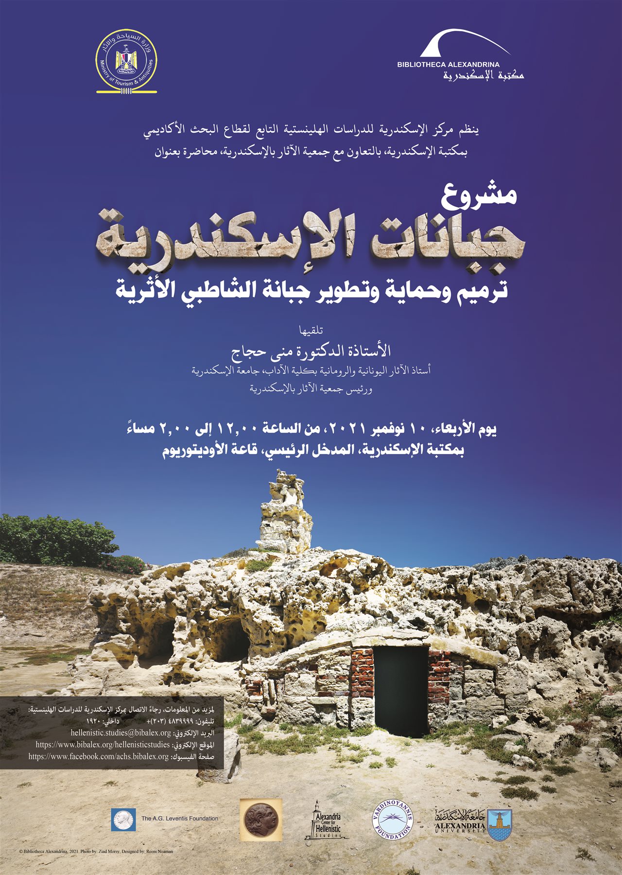 تنظم مكتبة الإسكندرية من خلال مركز الإسكندرية للدراسات الهلينستية التابع لقطاع البحث الأكاديمي بمكتبة الإسكندرية، بالتعاون مع جمعية الآثار بالإسكندرية؛ محاضرة بعنوان مشروع جبانات الإسكندرية - ترميم وحماية وتطوير جبانة الشاطبي الأثرية، تلقيها الدكتورة منى حجاج أستاذ الآثار اليونانية والرومانية بكلية الآداب، جامعة الإسكندرية ورئيس جمعية الآثار بالإسكندرية، وذلك الساعة 12 من ظهر يوم الأربعاء الموافق 10 نوفمبر 2021، بقاعة الأوديتوريوم المدخل الرئيسي بمكتبة الإسكندرية.