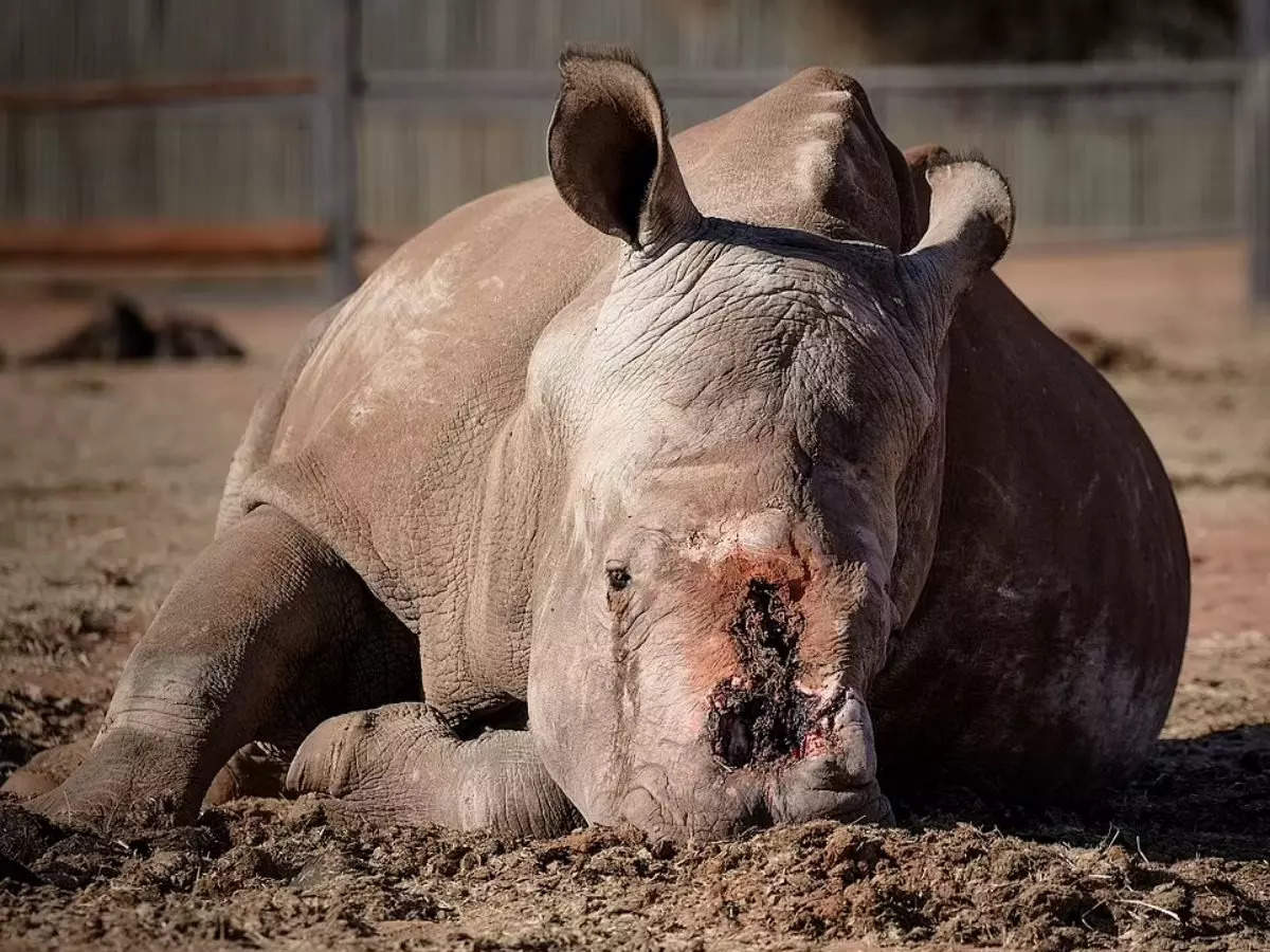 وفي الصور المتداولة، ظهر وحيد القرن مُلقى على الأرض في محمية الناجين بجنوب إفريقيا؛ مع علامات جافة من الدموع تنهمر على عينيه.
