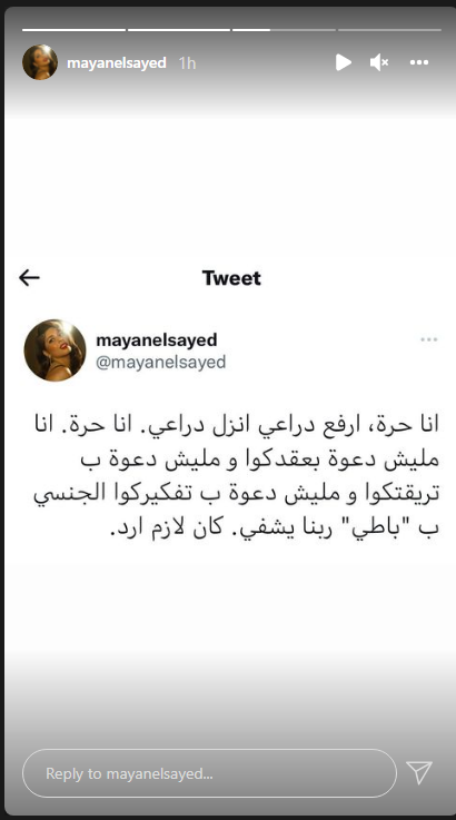 وكتبت مايان السيد عبر استوري حسابها الخاص بموقع تبادل الصور والفيديوهات انستجرام: أنا حرة أرفع أنزل دراعي، أنا مليش دعوة بعقدكوا ومليش دعوة بتريقتكوا ومليش دعوة بتفكيركوا الجنسي بـ “باطي”، ربنا يشفي، كان لازم أرد.
