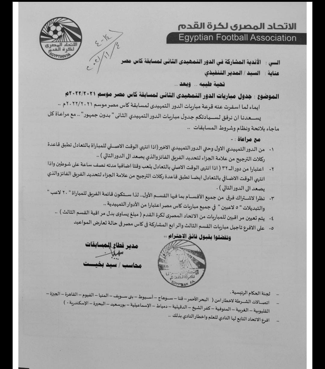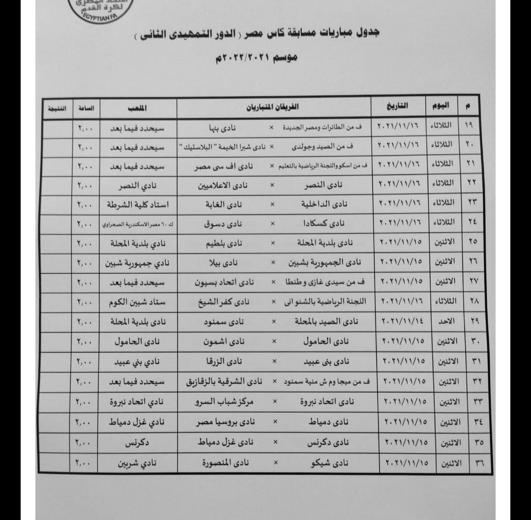 أعلن الاتحاد المصري لكرة القدم، مواعيد إقامة مباريات الدور التمهيدي الثاني لبطولة كأس مصر، في نسخته الجديدة موسم 2021 - 2022، بالإضافة إلى عدد من التعديلات في القائمة والتبديلات.