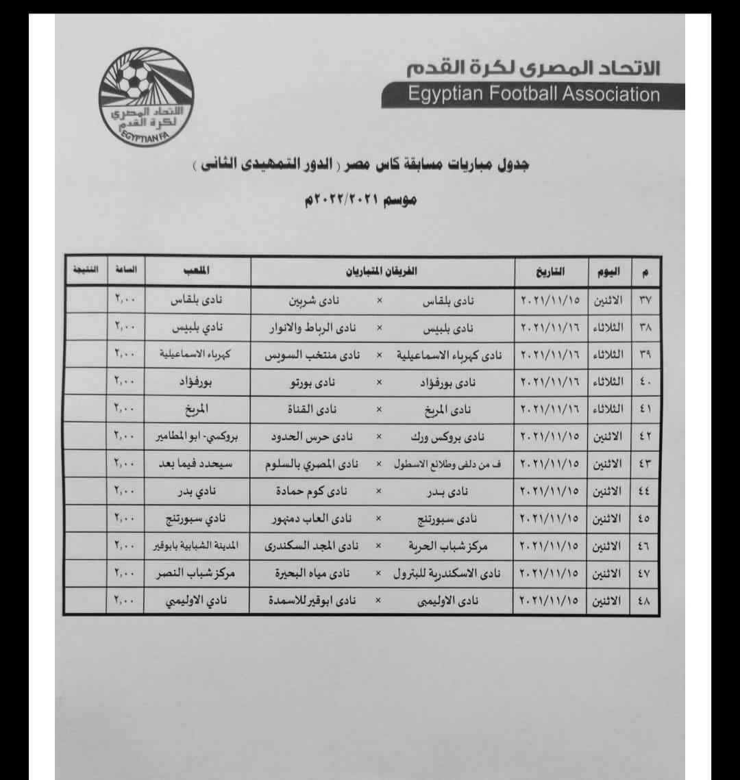 مواعيد مباريات الدور التمهيدي الثاني لبطولة كأس مصر