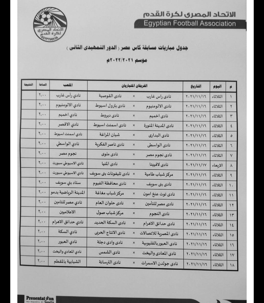أقيمت قرعة الدور الثاني التمهيدي من بطولة كأس مصر بمقر اتحاد الكرة المصري، في نسخته الجديدة موسم 2022/2021، يوم الثلاثاء الماضي، وبمشاركة أندية الأقسام الثاني والثالث والرابع.