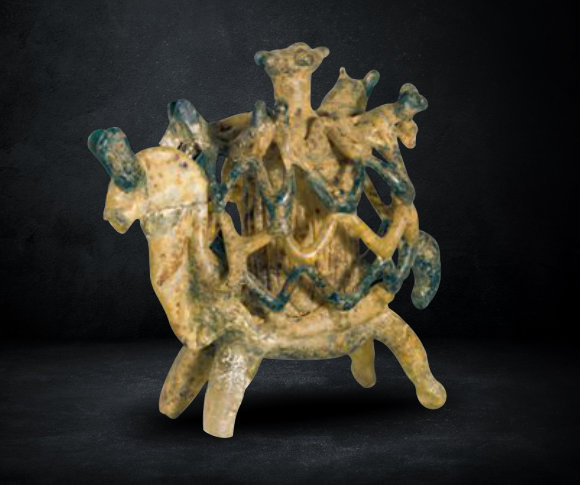 والإناء من الزجاج يحيط به شبكة مشكلة من الزجاج الملون، وترتكز الشبكة المحيطة به على ظهر جمل من الزجاج، وهو مثال لنوع من الأواني الصغيرة المركبة فوق تمثال حيوان أو طائر.