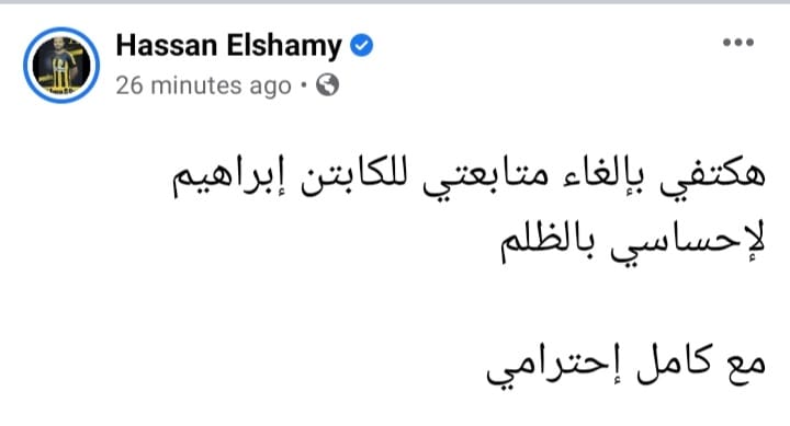 وكتب الشامي، عبر صفحته على موقع التواصل الاجتماعي فيسبوك: هكتفي بإلغاء متابعتي للكابتن إبراهيم لإحساسي بالظلم.. مع كامل إحترامي.