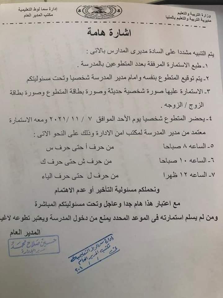 وعلى صعيد آخر، وجهت وزارة التربية والتعليم والتعليم الفني، إخطارا لإدارة سمالوط التعليمية بالمنيا بشأن بضرورة التنبيه على مديري المدارس طبع استمارة التطوع بالتدريس بعدد المتطوعين بالمدرسة.