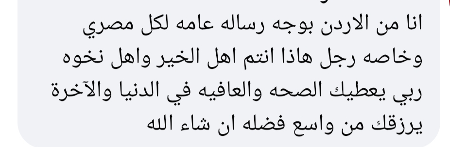 وأضاف آخر: انا من الاردن بوجه رسالة عامة لكل مصري وخاصه رجل هاذا انتم اهل الخير واهل نخوة ربي يعطيك الصحه والعافيه في الدنيا والآخرة يرزقك من واسع فضله ان شاء الله.