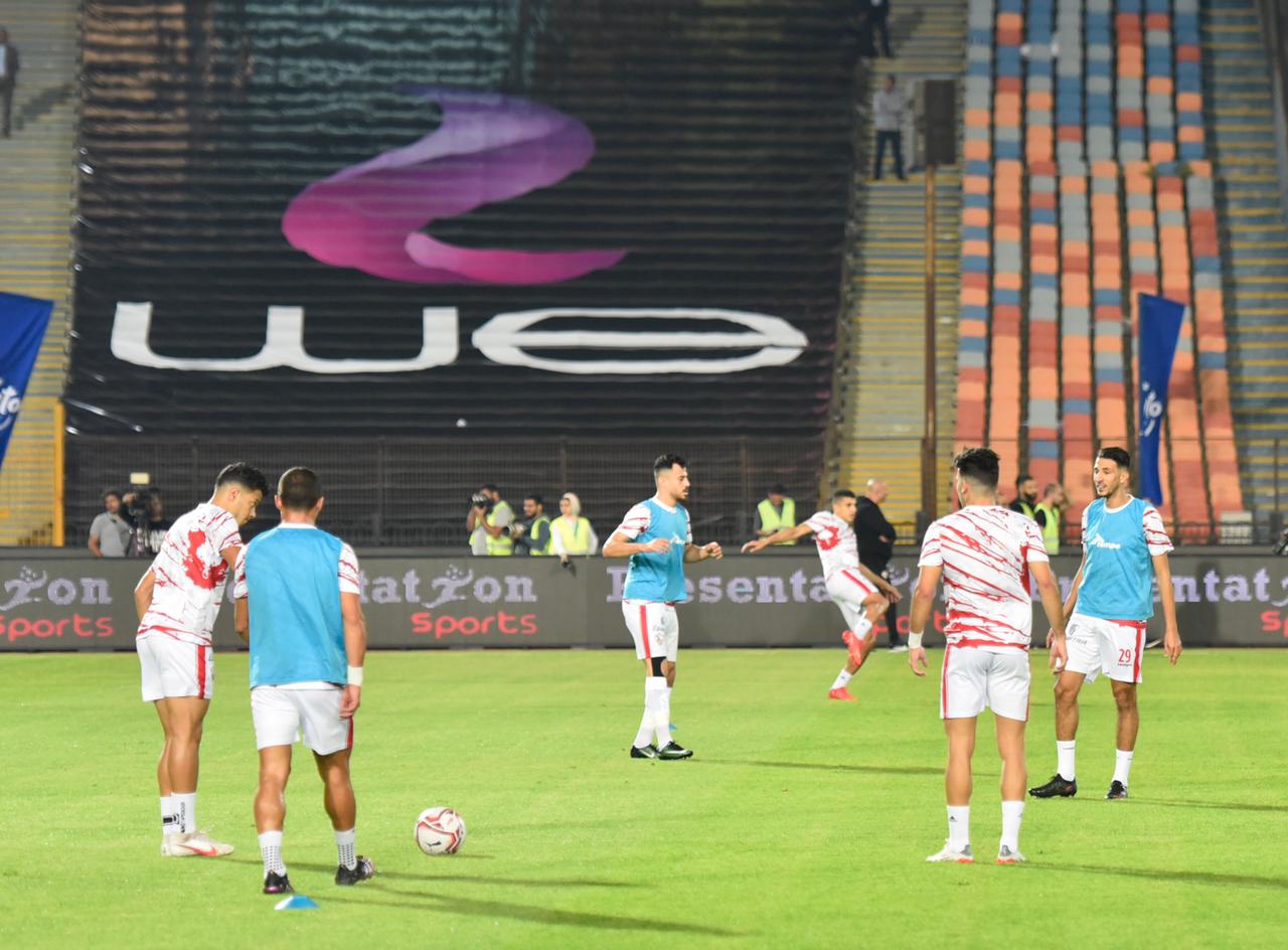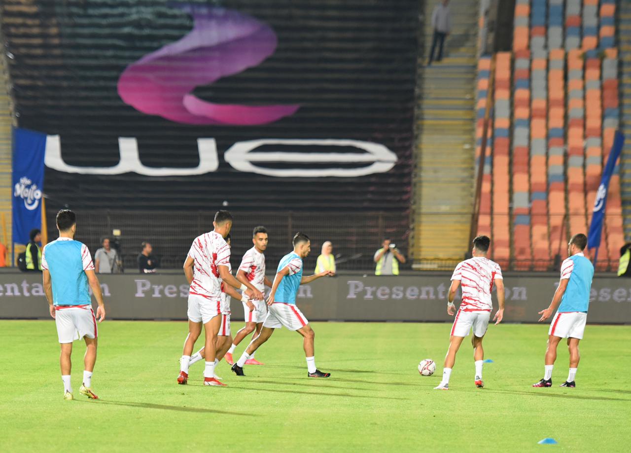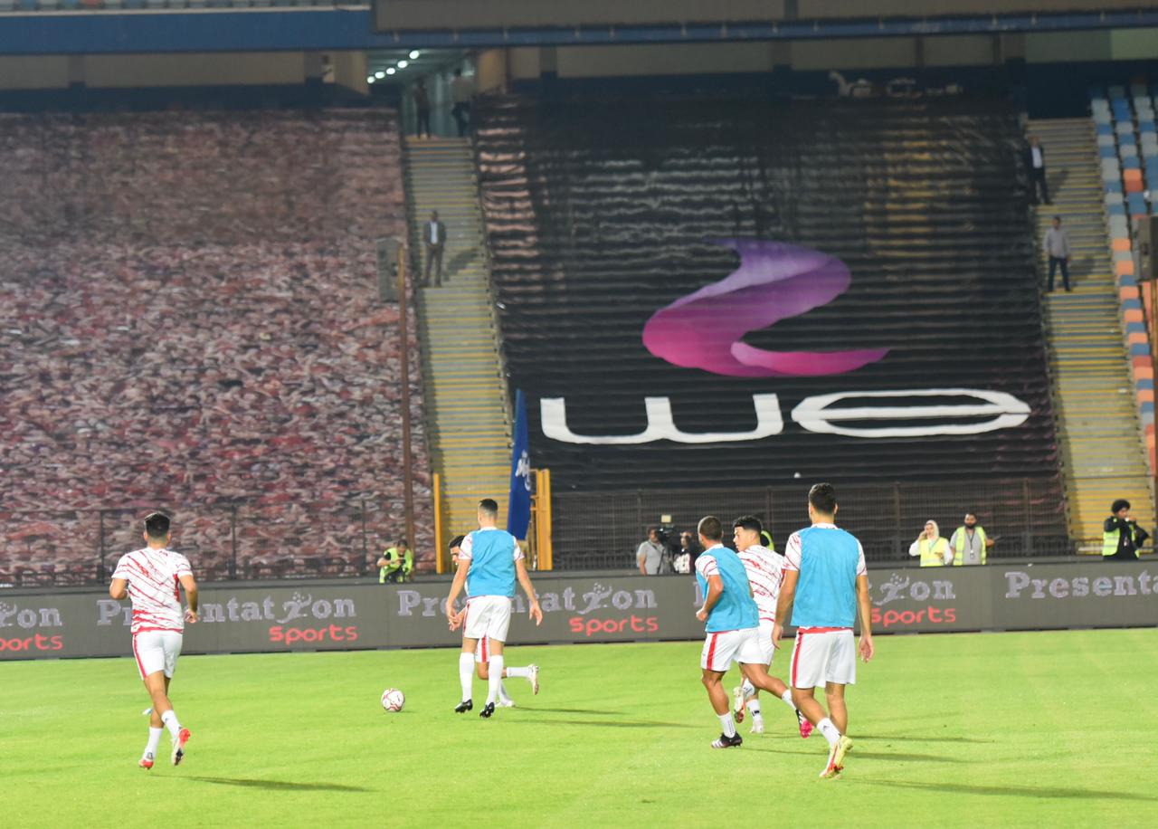 وأدى لاعبو الفريقين، العمليات الإحمائية على أرض الملعب استعدادًا لانطلاق المباراة وذلك وسط أجواء حماسية من جماهير الفريقين الحاضرة في الملعب.