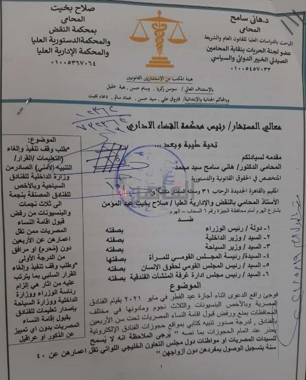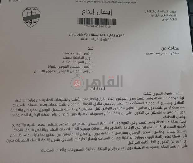 وطالبت الدعوى التي أقامها المحاميان هاني سامح وصلاح بخيت، التي حملت رقم 48010 لسنة 75 قضائية، بإلغاء القرار والتعليمات الأمنية والتنبيهات الصادرة من وزارة الداخلية للفنادق والبنسيونات وجميع المنشآت ذات الصلة وبالأخص فنادق النجمة الواحدة والثلاثة نجوم، والقاضي بعدم السماح للسيدات المصريات أو مواطنات دول مجلس التعاون الخليجي اللواتي تقل أعمارهنّ عن 40 سنة، بتسجيل الوصول بمفردهنّ والإقامة دون أزواجهنّ أو أقاربهنّ من الذكور.