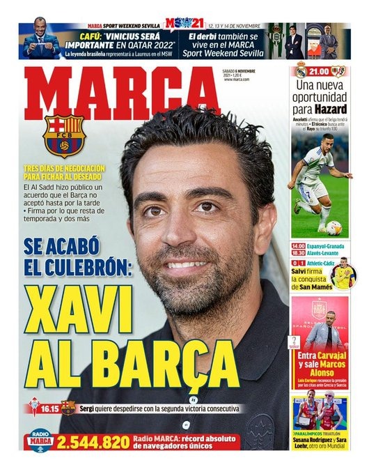 عنونت صحيفة ماركا الإسبانية، في غلافها بـ تشافي في برشلونة، كما سلطت الضوء على تصريحات أنشيلوتي عن إيدين هازارد، وذلك تحت عنوان، فرصة جديدة لهازارد...أنشيلوتي يؤكد أن البلجيكي سيكون لديه دقائق.