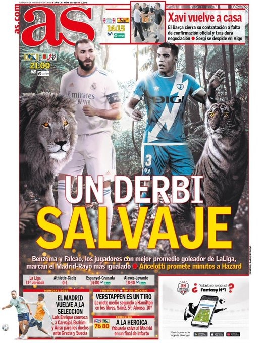 سلطت صحيفة آس الإسبانية الضوء في غلافها على ديربي اليوم، الذي سيشهد منافسة بين بنزيما وفالكاو في لقاء رايو فاليكانو وريال مدريد، وذلك تحت عنوان ديربي متوحش...بنزيما وفالكاو اللاعبان اللذان سجلا أفضل معدل أهداف في الليجا.