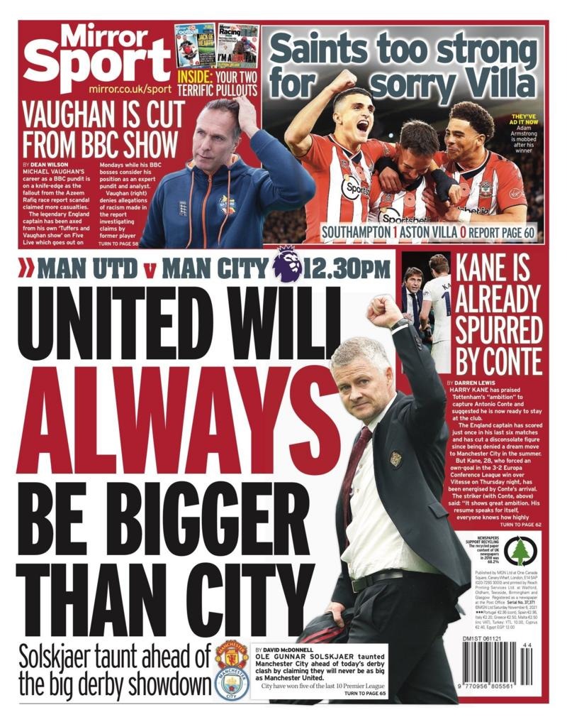 تصدر غلاف صحيفة ميرور الإنجليزية، عنوانًا مثيرًا بسبب حالة القلق العام في مدينة مانشستر وترقب مباراة الديربي بين مانشستر سيتي ومانشستر يونايتد، وذلك تحت ذكر تصريح سولشاير عن المباراة بعنوان، مانشستر يونايتد دائمًا أكبر من السيتي.