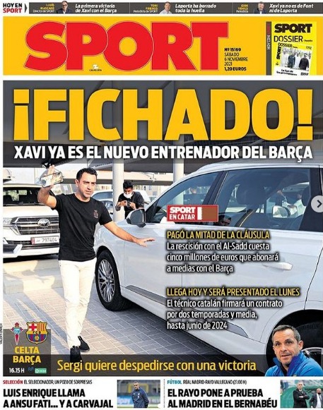 عنونت صحيفة سبورت صفحة غلافها بالعنوان: تشافي بالفعل هو المدرب الجديد لبرشلونة.