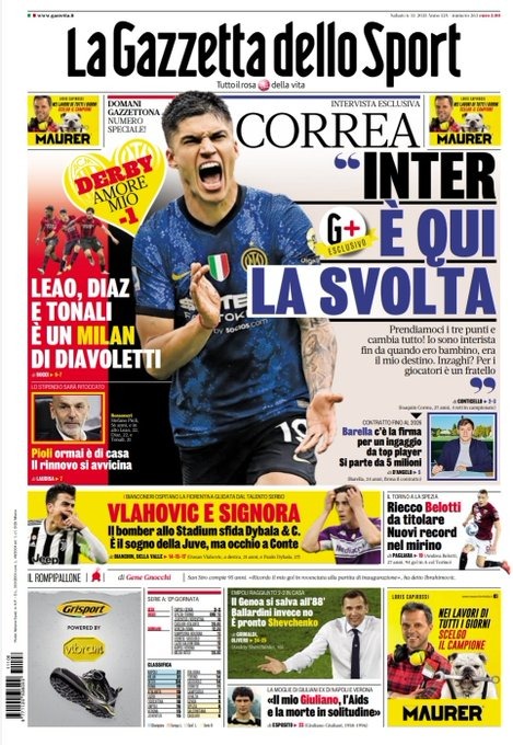نشرت صحيفة لا جازيتا مقابلة مع خواكين كوريا لاعب فريق إنتر قبل لقاء الديربي، وتصدر العنوان سنحصل على النقاط الـ 3، وسيتغير كل شيء! أنا من مشجعي إنتر منذ أن كنت صغيرًا، لقد كان قدري.