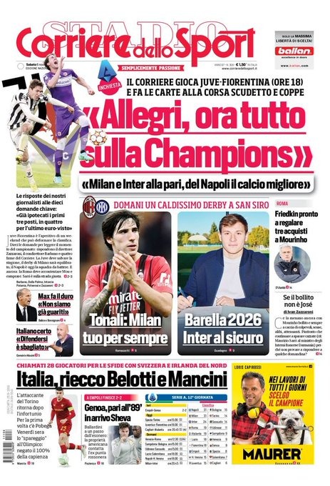 وجاء في غلاف صحيفة كوريري اليوم عنوان: ميلان وإنتر متساويان، نابولي يلعب أفضل كرة قدم، كما تحدثت عن مباراة الديربي المقرر انطلاقها غدًا بين إنتر وميلان تحت عنوان، غدا الديربي الساخن في سان سيرو.