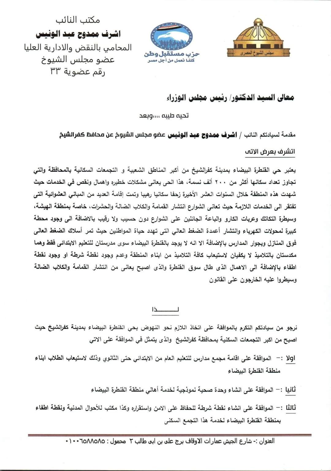 وطالب النائب أشرف عبد الونيس، بالموافقة على اتخاذ اللازم نحو النهوض بحي القنطرة البيضاء بمدينة كفر الشيخ، من خلال إقامة مجمع مدارس للتعليم العام من الابتدائي حتى الثانوي، وذلك لاستيعاب الطلاب أبناء منطقة القنطرة البيضاء، وإنشاء وحدة صحية نموذجية لخدمة الأهالي، وإنشاء نقطة شرطة للحفاظ على الأمن واستقراره، وكذا مكتب للأحوال المدنية ونقطة إطفاء بمنطقة القنطرة البيضاء لخدمة هذا التجمع السكني.