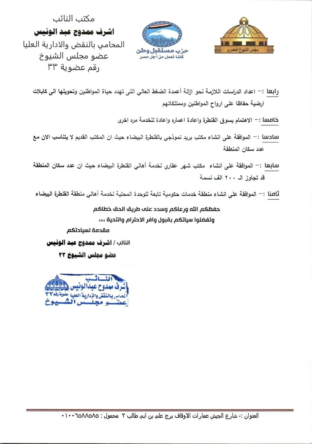 وناشد بالموافقة على إنشاء مكتب شهر عقاري لخدمة أهالي القنطرة البيضاء، حيث أن عدد سكان المنطقة قد تجاوز الـ 200 ألف نسمة، فضلًا عن الموافقة على إنشاء منطقة خدمات حكومية تابعة للوحدة المحلية لخدمة أهالي منطقة القنطرة البيضاء.