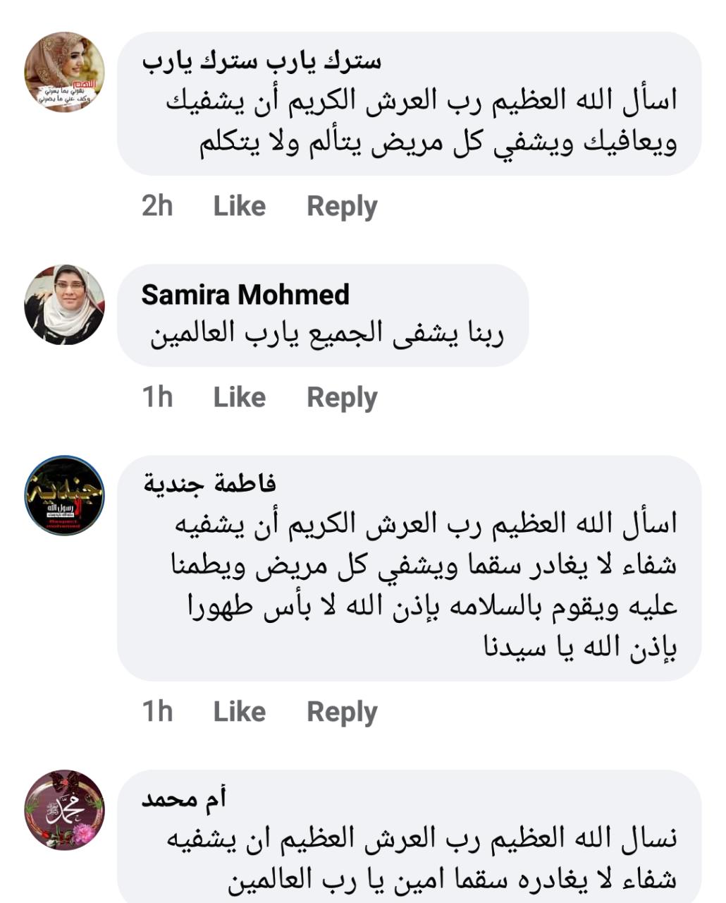 وعلق آخر: أسأل الله العظيم رب العرش الكريم أن يشفيك ويعافيك ويشفي كل مريض يتألم ولا يتكلم، إلى جانب سميرة محمد التي علقت: ربنا يشفى الجميع يا رب العالمين.