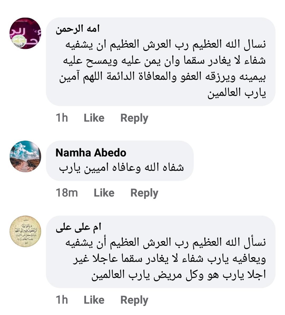 بينما قال حساب آخر: شفاه الله وعافاه أمين يا رب، إلى جانب أم علي التي كتبت: نسأل الله العظيم رب العرش العظيم أن يشفيه ويعافيه يا رب شفاء لا يغادر سقما عاجلا غير آجل يا رب هو وكل مريض يا رب العالمين.
