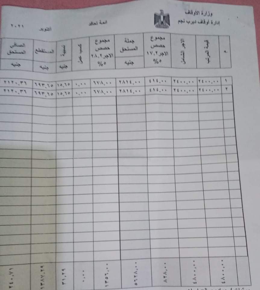 تجدر الإشارة إلى أن فرض ضريبة كسب عمل على رواتب الأئمة المتعاقدين مع وزارة الأوقاف، بنظام المكافأة، أجر مقابل عمل، وغيرهم من العمال بمديرية أوقاف الإسماعيلية، لا يحدث في بقية مديريات الأوقاف بالمحافظات الأخرى؛ كما هو مُوضح بالصور السابقة.