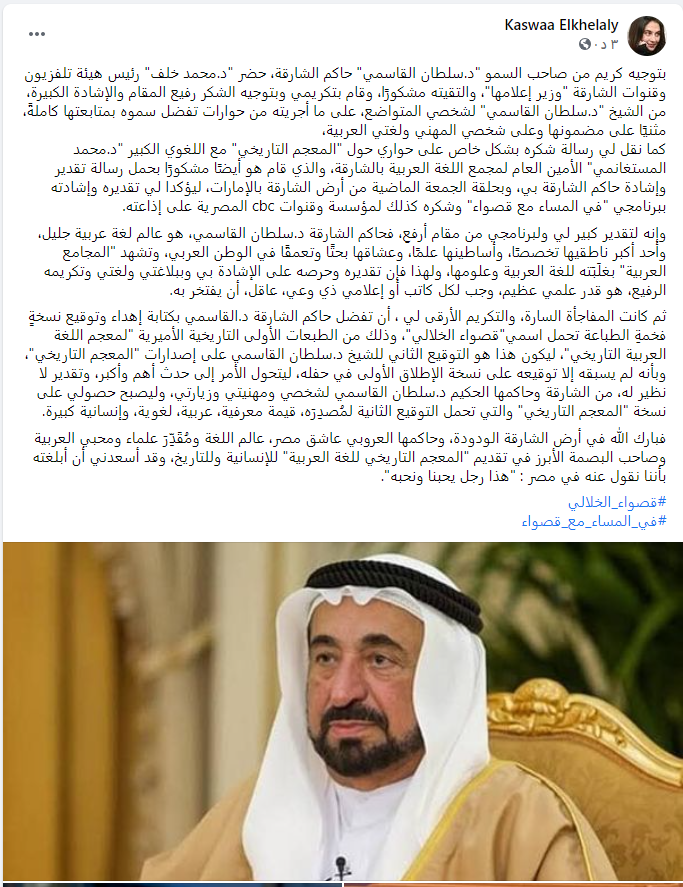 وتابعت قصواء الخلالي:" كما نقل لي رسالة شكره بشكل خاص على حواري حول "المعجم التاريخي" مع اللغوي الكبير "د.محمد المستغانمي" الأمين العام لمجمع اللغة العربية بالشارقة، والذي قام هو أيضًا مشكورًا بحمل رسالة تقدير وإشادة حاكم الشارقة بي، وبحلقة الجمعة الماضية من أرض الشارقة بالإمارات، ليؤكدا لي تقديره وإشادته ببرنامجي "في المساء مع قصواء" وشكره كذلك لمؤسسة وقنوات cbc المصرية على إذاعته".