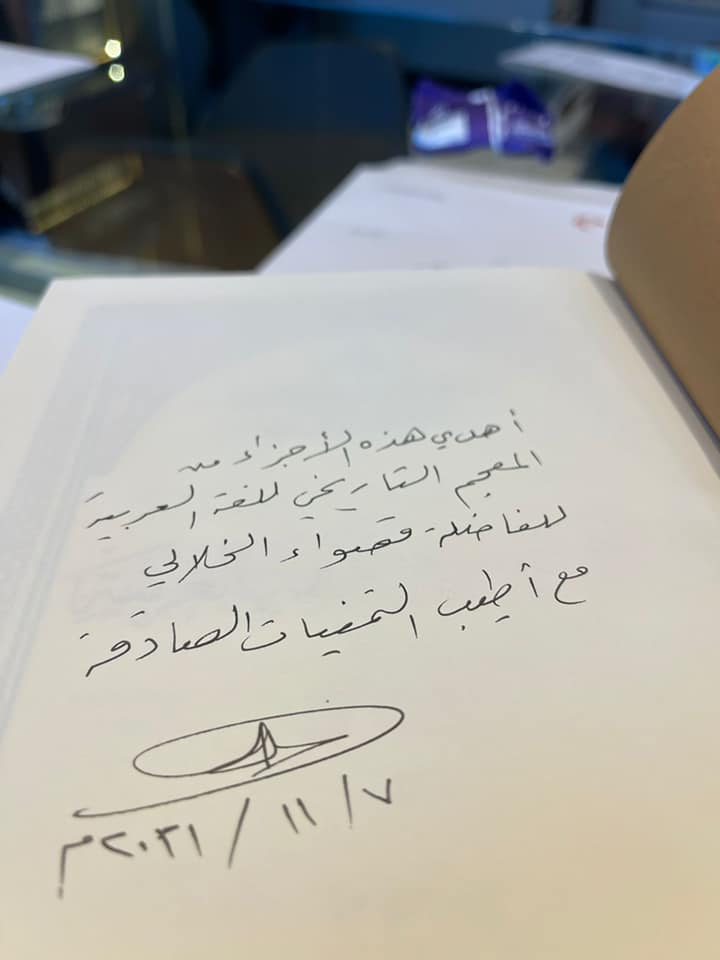 وأردفت قصواء الخلالي: "ثم كانت المفاجأة السارة، والتكريم الأرقى لي، أن تفضل حاكم الشارقة د.القاسمي بكتابة إهداء وتوقيع نسخةٍ فخمةِ الطباعة تحمل اسمي "قصواء الخلالي"، وذلك من الطبعات الأولى التاريخية الأميرية "لمعجم اللغة العربية التاريخي"، ليكون هذا هو التوقيع الثاني للشيخ د.سلطان القاسمي على إصدارات "المعجم التاريخي".