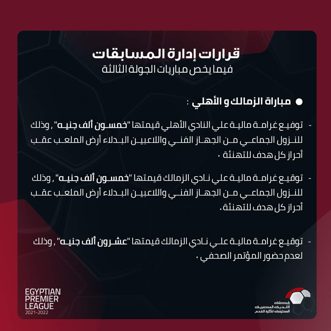 أعلنت رابطة الأندية المحترفة برئاسة أحمد دياب عن قرارات إدارة المسابقات بشأن مباراة الأهلي والزمالك ضمن مباريات الجولة الثالثة من مسابقة الدوري المصري الممتاز.