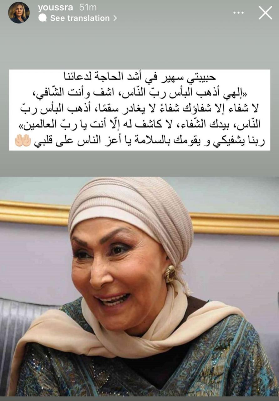 ونشرت يسرا، صورة لسهير البابلي عبر خاصية ستوري لحسابها الشخصي على موقع تبادل الصور والفيديوهات القصيرة انستجرام، وعلقت قائلةً: حبيبتي سهير في أشد الحاجة لدعائنا، إلهي أذهب البأس، رب الناس، اشف وأنت الشافي، لا شفاء إلا شفائك شفاء لا يغادر سقما، اذهب البأس رب الناس، بيدك الشفاء لا كاشف له إلا أنت يارب العالمين، ربنا يشفيكي ويقومك بالسلامة يا أعز الناس على قلبي.