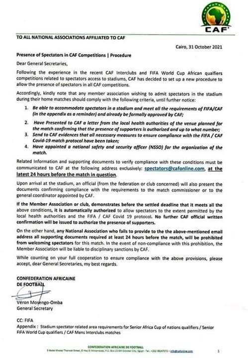 بعد التجربة في منافسات كاف للأندية الأخيرة ومسابقات تصفيات كأس العالم الإفريقية المتعلقة بحضور الجماهير في الملاعب؛ قرر الاتحاد وضع إجراء جديد للسماح بحضور المتفرجين في جميع المسابقات.