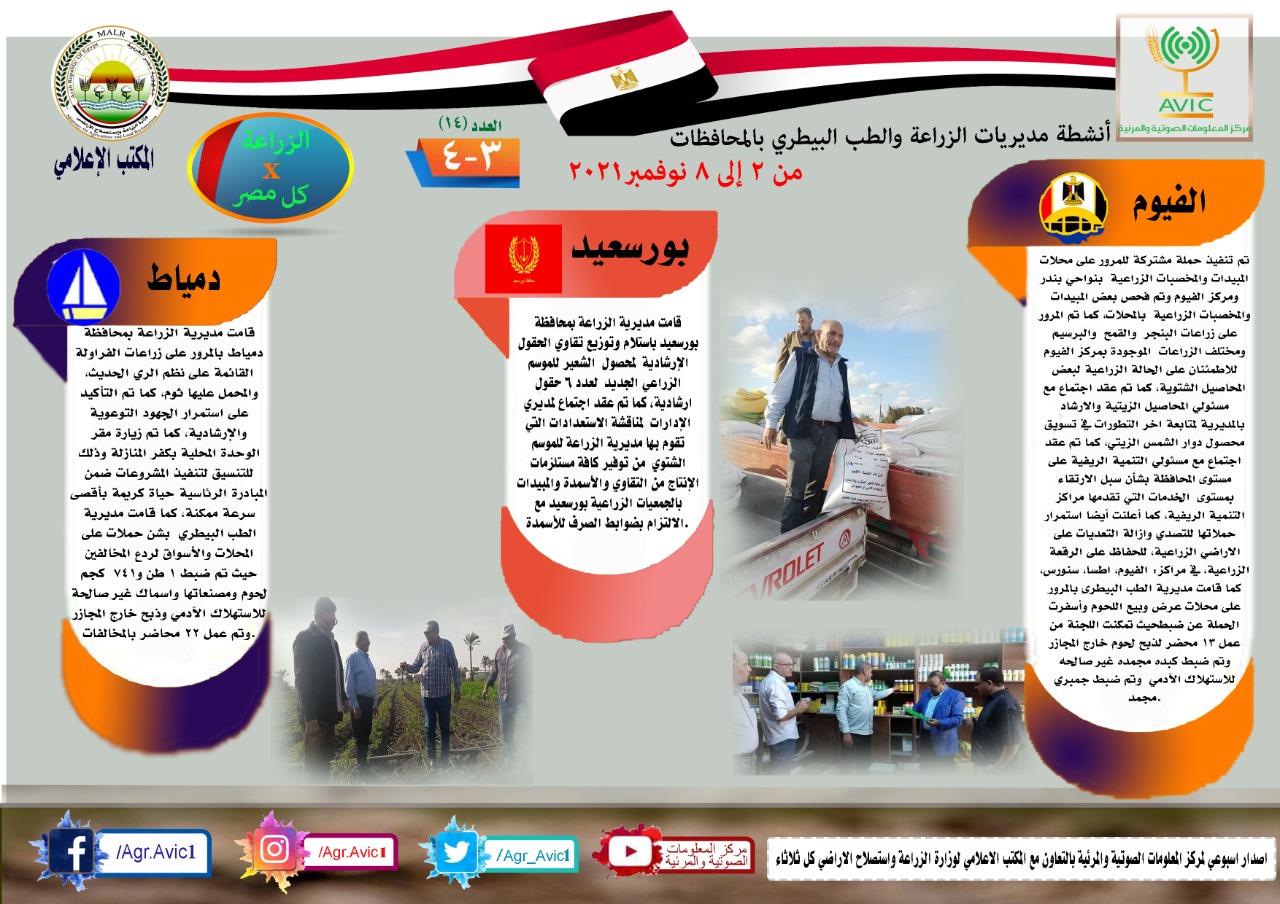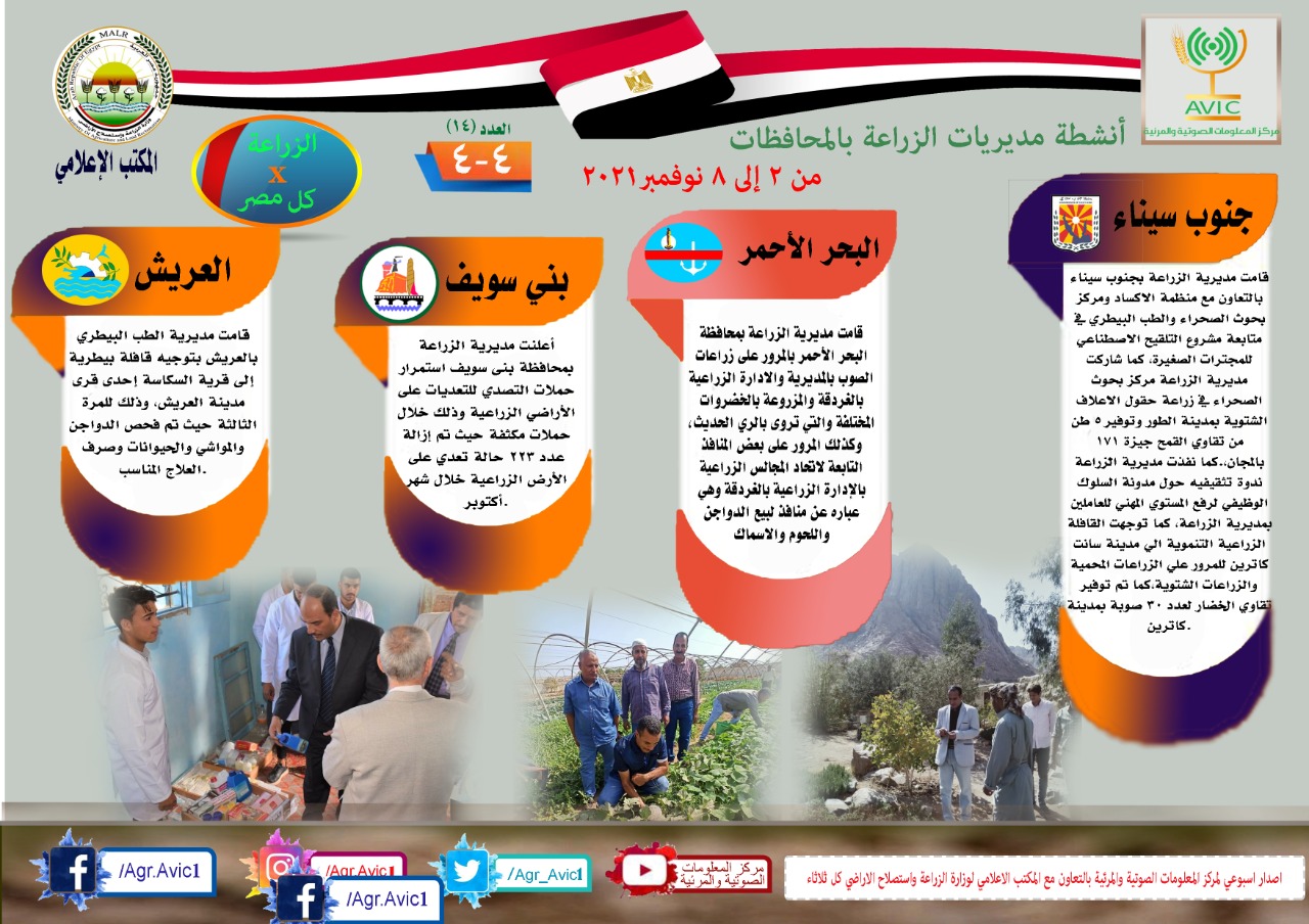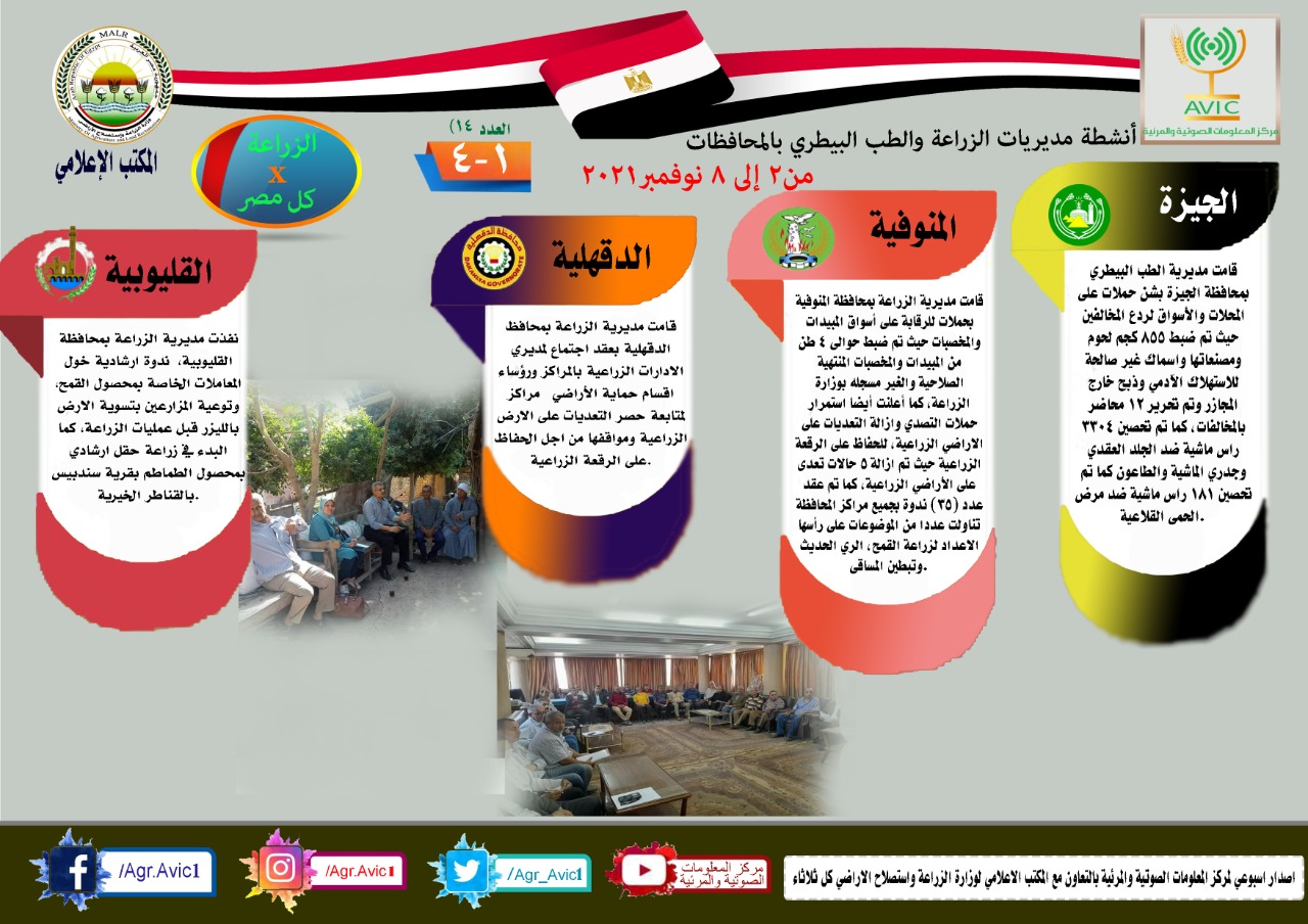 أصدر مركز المعلومات الصوتية والمرئية التابع لوزارة الزراعة واستصلاح الأراضي، والمكتب الإعلامي للوزارة، العدد رقم 14 من اصدار «الزراعة في كل مصر» بالانفوجراف، يوضح الجهود والأنشطة التي تقوم بها مديريات الزراعة والطب البيطري بمحافظات الجمهورية خلال الفترة من2 وحتى 8 نوفمبر الجاري.