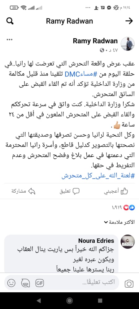 وتابع رضوان في منشوره: أوجه الشكر والتحية للفتاة التي تعرضت للتحرش تدعى رانيا، وحسن تصرفها وصديقتها التي نصحتها بالتصوير كدليل قاطع، وأسرة رانيا المحترمة التي دعمتها في عمل بلاغ وفضح المتحرش وعدم التفريط في حقها.