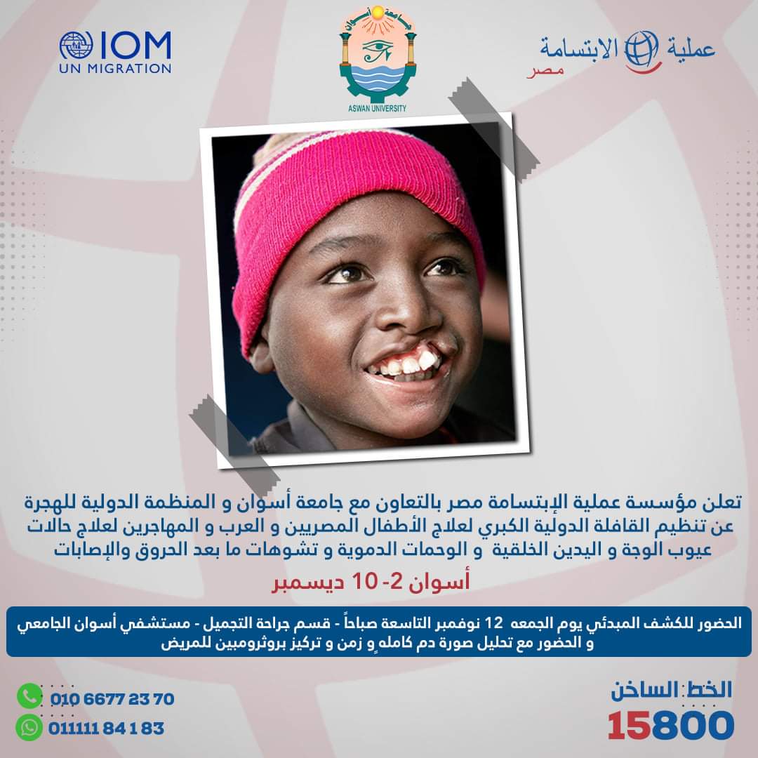 أعلنت جامعة أسوان عن إطلاق قافلة شاملة في تخصص الإصلاح التجميلي، في الفترة ما بين 2 إلى 10 ديسمبر، وذلك بإشراف مؤسسة ابتسامة الدولية ومنظمة الهجرة الدولية، بعد تحضيرات استمرت لأكثر من 6 شهور.