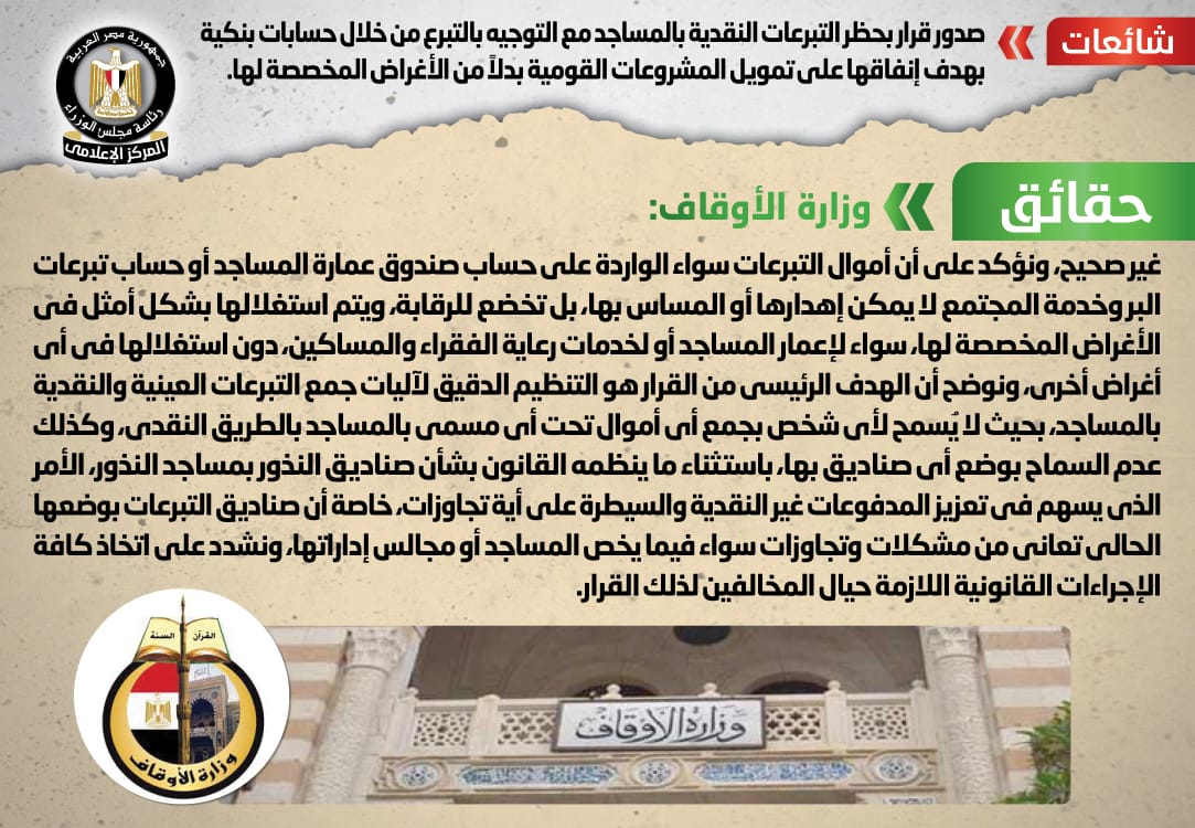 وتواصل المركز الإعلامي لمجلس الوزراء مع وزارة الأوقاف، التي نفت تلك الأنباء، مؤكدةً أنه لا صحة لإنفاق تبرعات المساجد الواردة عبر الحسابات البنكية على تمويل المشروعات القومية بدلًا من الأغراض المخصصة لها، وأن أموال التبرعات سواء الواردة على حساب صندوق عمارة المساجد أو حساب تبرعات البر وخدمة المجتمع لا يمكن إهدارها أو المساس بها، بل تخضع للرقابة، ويتم استغلالها بشكل أمثل في الأغراض المخصصة لها، سواء لإعمار المساجد أو لخدمات رعاية الفقراء والمساكين، دون استغلالها في أي أغراض أخرى.