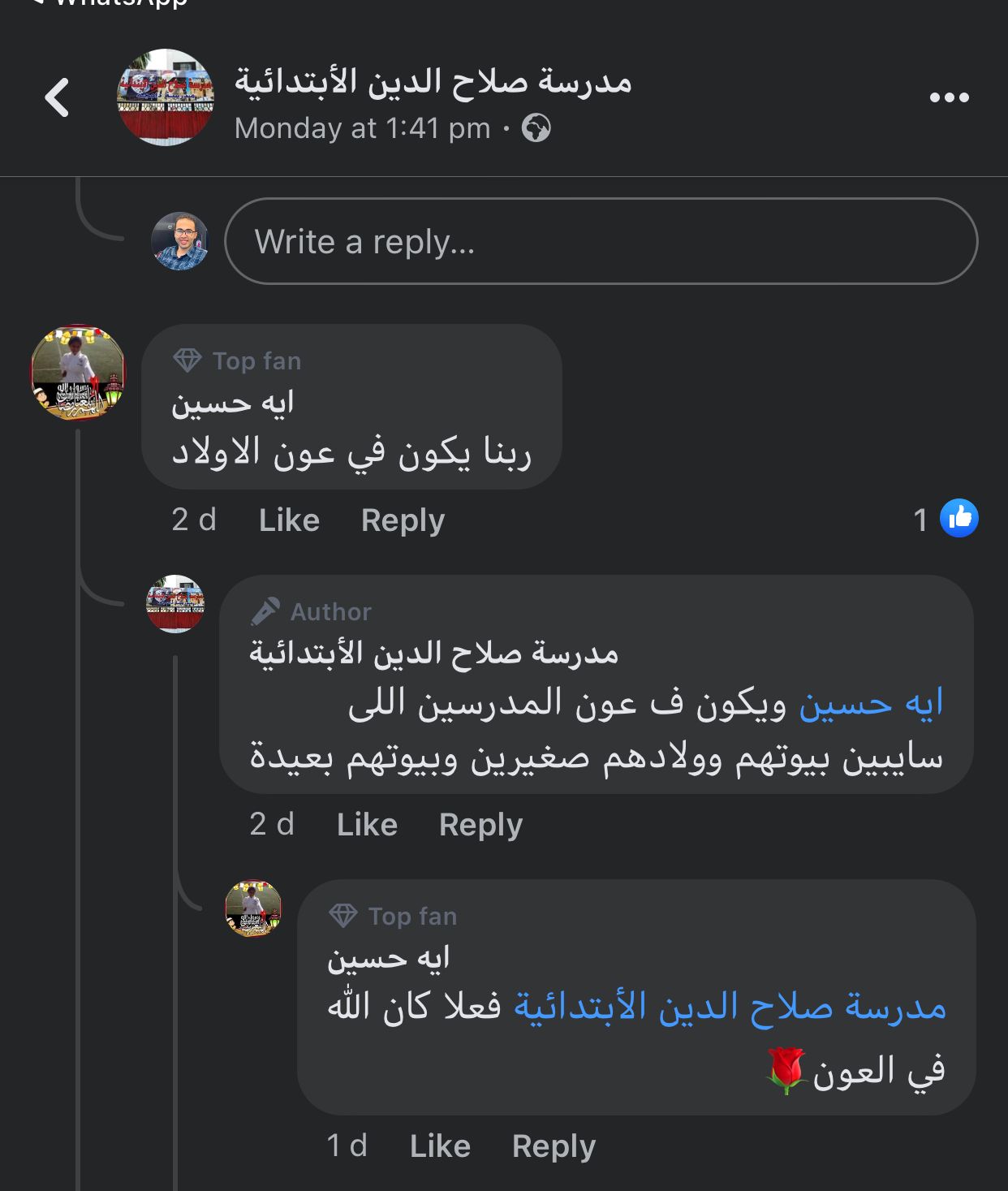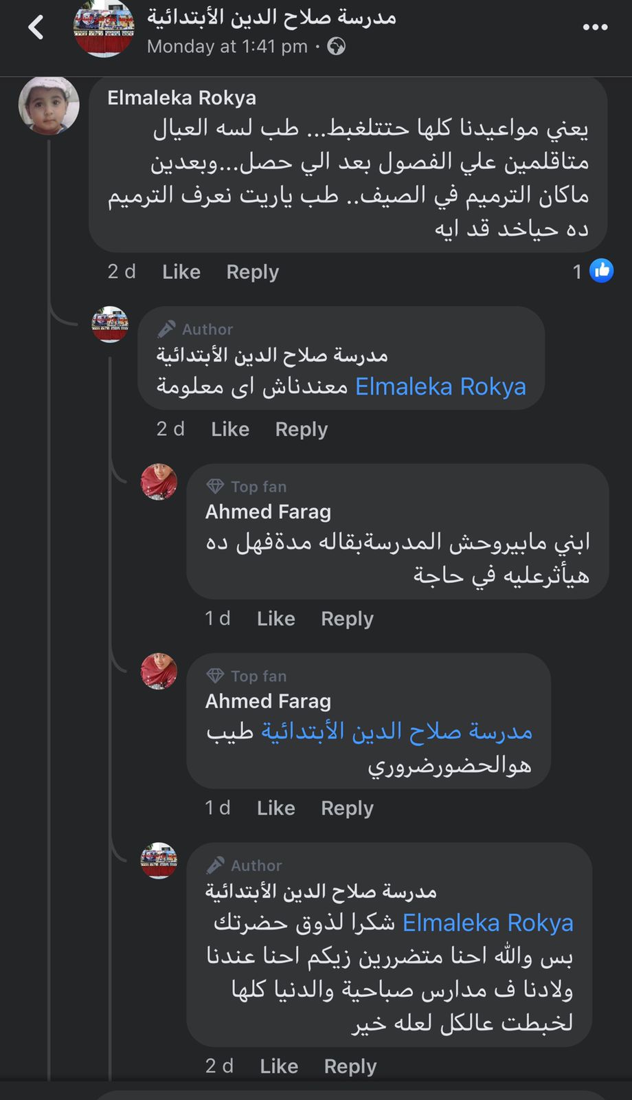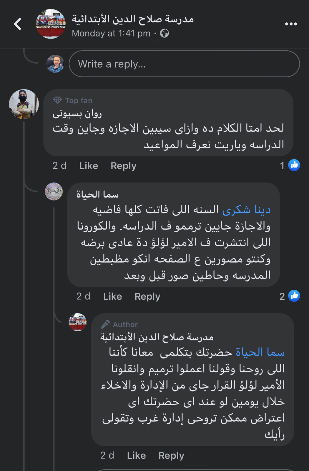 وفي رد آخر كتب المسئول عن صفحة المدرسة: ربنا يكون في عون المدرسين اللى سايبين بيوتهم وولادهم صغيرين وبيوتهم بعيدة.
