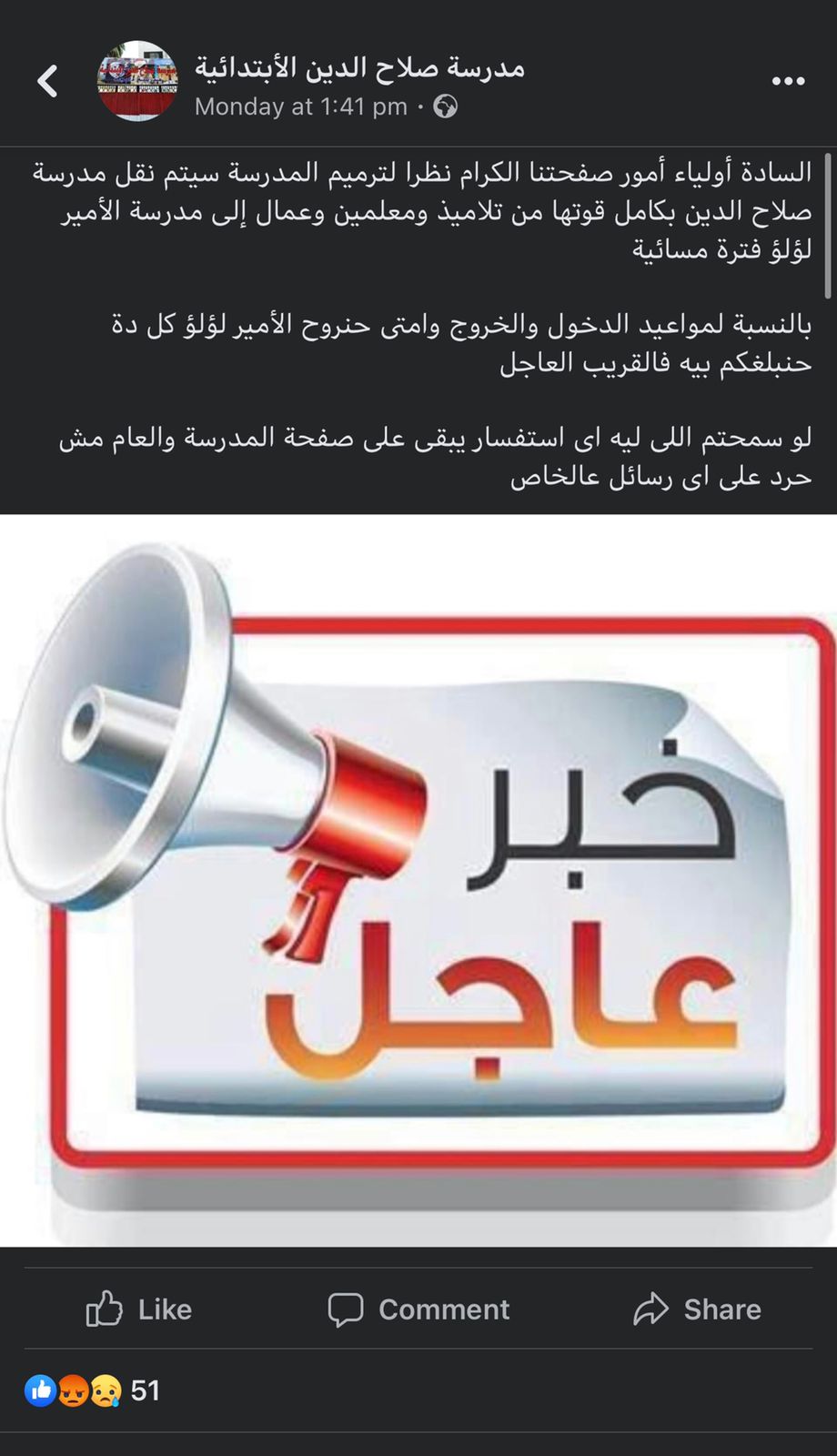 السادة أولياء أمور صفحتنا الكرام نظرا لترميم المدرسة سيتم نقل مدرسة صلاح الدين بكامل قوتها من تلاميذ ومعلمين وعمال إلى مدرسة الأمير لؤلؤ فترة مسائية، بالنسبة لمواعيد الدخول والخروج وامتى حنروح الأمير لؤلؤ كل ده هنبلغكم بيه فالقريب العاجل لو سمحتم اللي ليه أي استفسار يبقى على صفحة المدرسة والعام مش هرد على أي رسائل على الخاص.