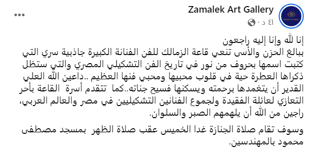 وكتبت صفحة جاليري الزمالك عبر صفحتها الرسمية على موقع فيسبوك: إنا لله وإنا إليه راجعون، ببالغ الحزن والأسى تنعى قاعة الزمالك للفن الفنانة الكبيرة جاذبية سري، التي كتبت اسمها بحروف من نور في تاريخ الفن التشكيلي المصري والتي ستظل ذكراها العطرة حية في قلوب محبيها ومحبي فنها العظيم.. داعين الله العلي القدير أن يتغمدها برحمته ويسكنها فسيح جناته.. كما تتقدم أسرة القاعة بأحر التعازي لعائلة الفقيدة ولجموع الفنانين التشكيليين في مصر والعالم العربي، راجين من الله أن يلهمهم الصبر والسلوان.