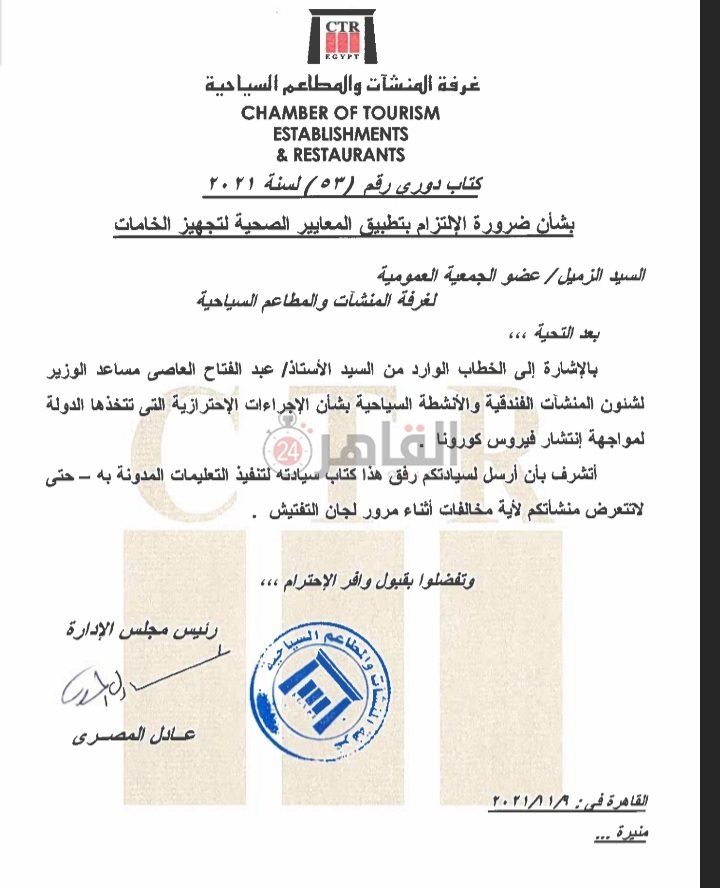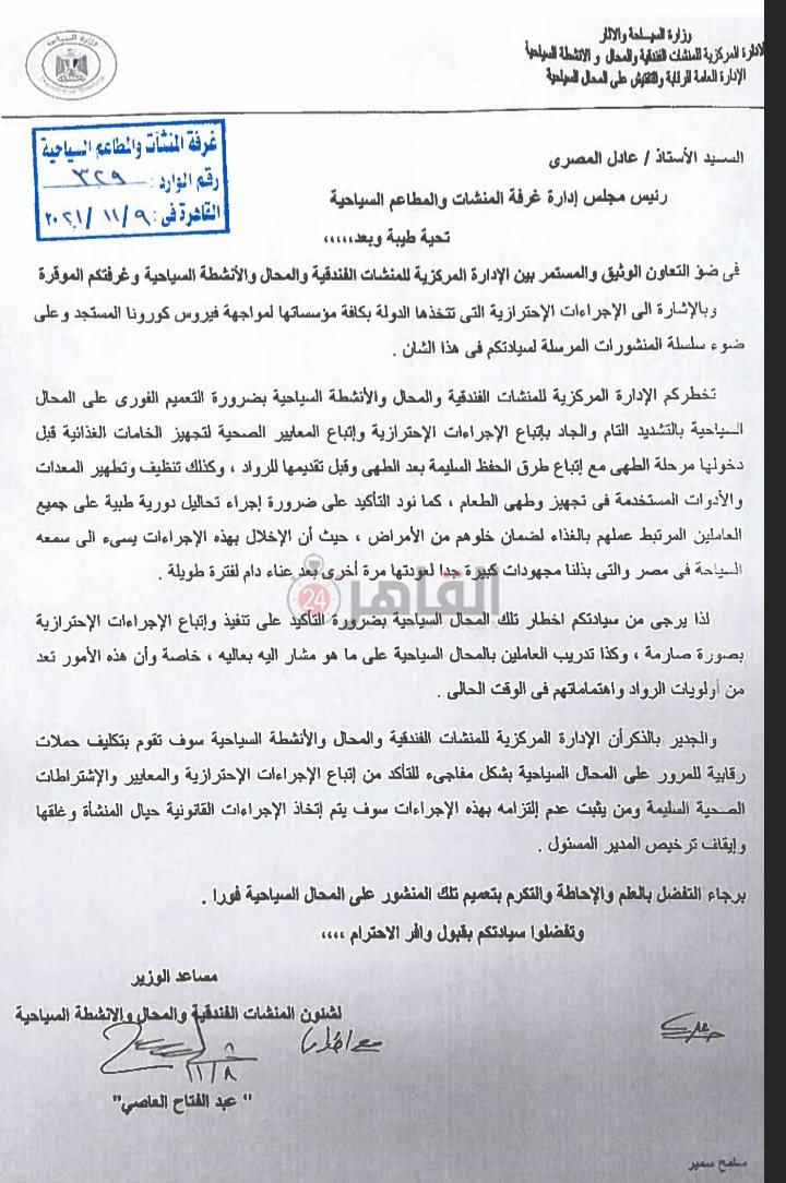 وحصل القاهرة 24 على نسخة من الخطاب المقدم من مساعد وزير السياحة والآثار للرقابة على المنشآت الفندقية والمحال والأنشطة السياحية، والذي يؤكد ضرورة الالتزام بجميع التعليمات والإجراءات على الطعام داخل المنشآت السياحية، ومنها: