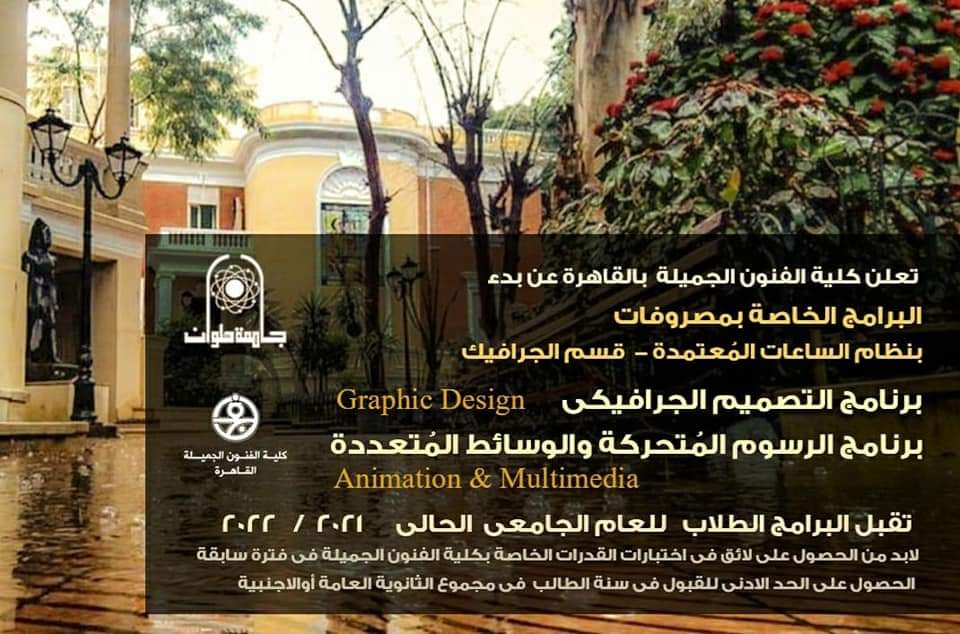 أعلنت كلية الفنون الجميلة جامعة حلوان، بدء الالتحاق بالبرامج الخاصة بقسم الجرافيك للعام الجامعي الحالي، وذلك تحت رعاية الدكتور ممدوح مهدي، القائم بعمل رئيس الجامعة والدكتور عمرو سامي عميد كلية الفنون الجميلة، وهي برامج التصميم الجرافيكى Graphic Design، برنامج الرسوم المتحركة والوسائط المتعددة Animation and multimedia.