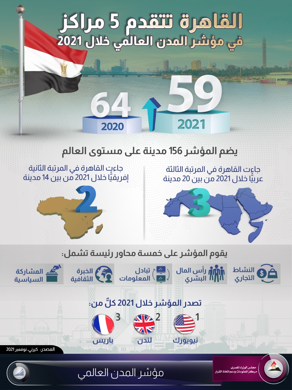 نشر مركز المعلومات ودعم اتخاذ القرار، إنفوجرافيك جديدًا يرصد تقدم القاهرة 5 مراكز في مؤشر المدن العالمي لعام 2021، لتصعد بذلك إلى المرتبة الـ 59 وذلك مقارنة بالمرتبة الـ 64 خلال 2020.