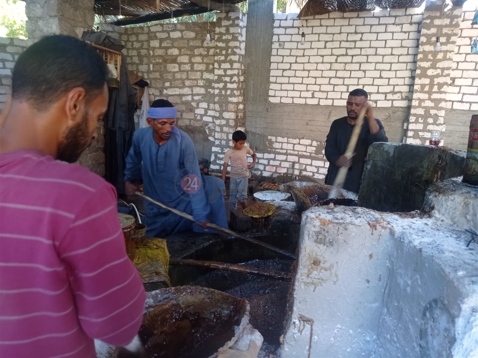 وقال خالد أبو فوزي، أحد أصحاب مصانع الجلاب بقرية القناوية لـ القاهرة 24، إن صناعة الجلاب تعتمد على الطريقة البدائية والجهد البشري ولا تتدخل فيها الآلات الحديثة، موضحا أن العمال يصبون العسل الأسود في نحاسة، وهو عبارة عن موقد تحته نار بدرجة حرارة مرتفعة حتى يصل العسل بداخلها إلى درجة الغليان، في فترة تستغرق 10 دقائق تقريبا، ثم ينقل إلى المحالب وهي إناء مصنوع من الألومنيوم، ويتم فيه إضافة الكربونات، وتقليبها مع العسل المغلي لمدة نصف دقيقة بالضرابة أو المضرب، لزيادة الكمية وتخفيف الوزن الوزن، كما أن الكربونات تعطي الجلاب اللون الفاتح المعروف.